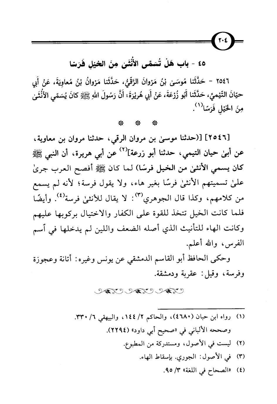 2546 - حَدَّثَنا مُوسَى بْنُ مَرْوانَ الرَّقّيُّ، حَدَّثَنا مَرْوانُ بْنُ مُعاوِيَةَ، عَنْ أَبي حيّانَ التّيْميِّ، حَدَّثَنا أَبُو زُرْعَةَ، عَنْ أَبي هُريْرَةَ: أَنَّ رَسُولَ اللهِ - صلى الله عليه وسلم - كانَ يُسَمّي الأنْثَى مِنَ الخيْلِ فَرَسًا (¬1).