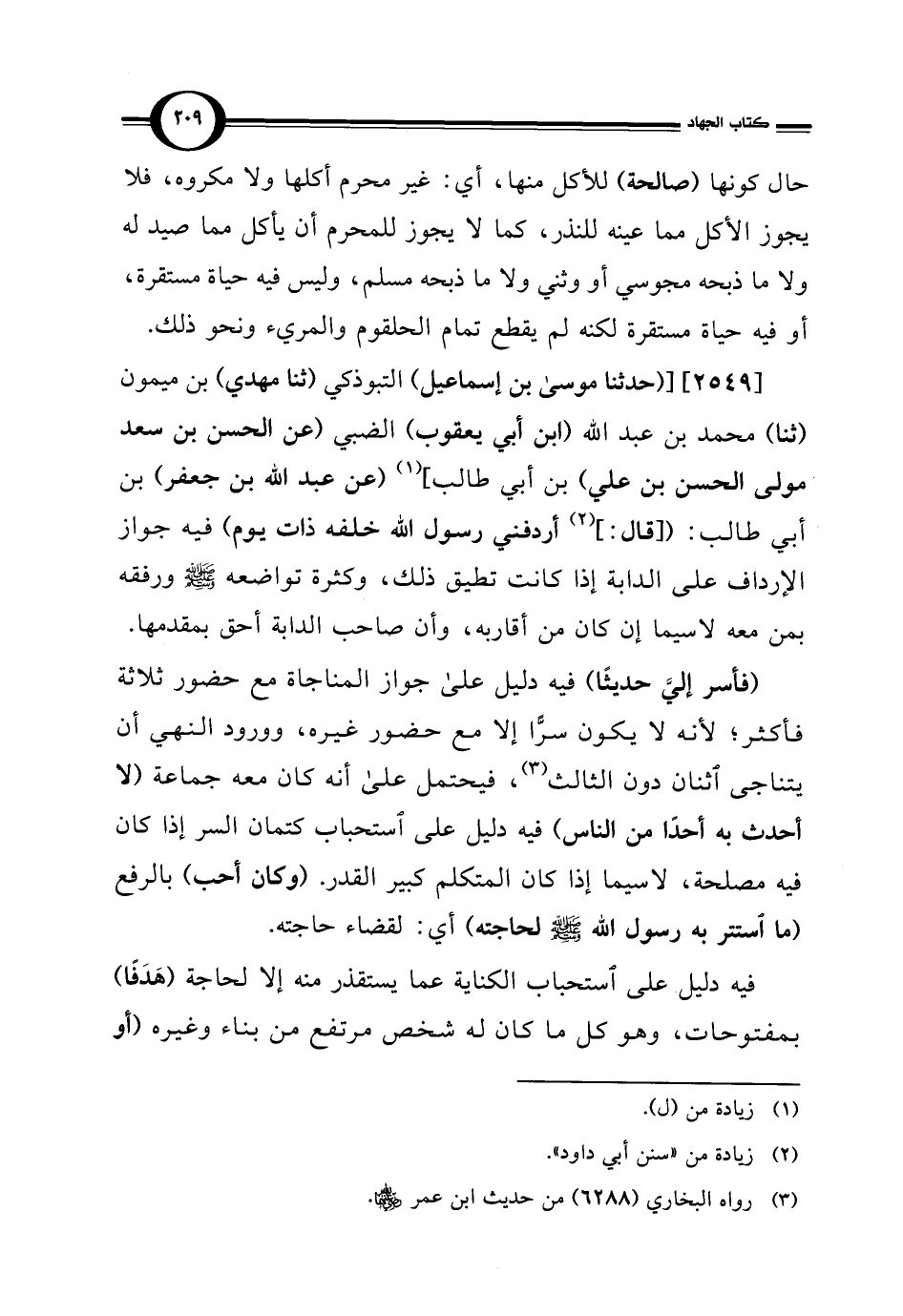 [2549] [(حدثنا موسى بن إسماعيل) التبوذكي (ثنا مهدي) بن ميمون (ثنا) محمد بن عبد الله (ابن أبي يعقوب) الضبي (عن الحسن بن سعد مولى الحسن بن علي) بن أبي طالب] (¬1) (عن عبد الله بن جعفر) بن أبي طالب: ([قال: ] (¬2) أردفني رسول الله خلفه ذات يوم) فيه جواز الإرداف على الدابة إذا كانت تطيق ذلك، وكثرة تواضعه - صلى الله عليه وسلم - ورفقه بمن معه لاسيما إن كان من أقاربه، وأن صاحب الدابة أحق بمقدمها.