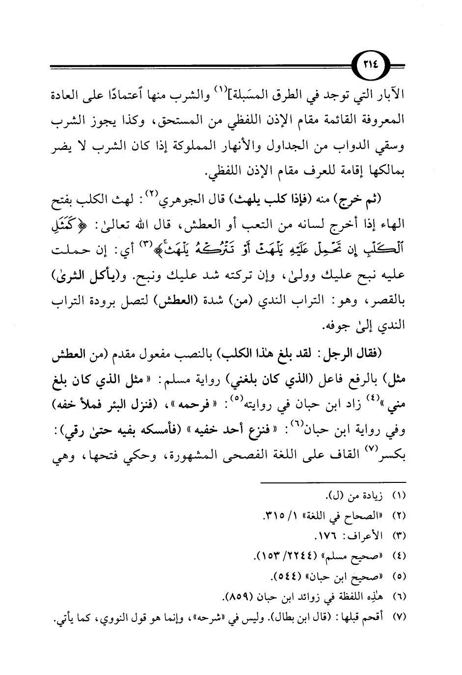 (ثم خرج) منه (فإذا كلب يلهث) قال الجوهري (¬2): لهث الكلب بفتح الهاء إذا أخرج لسانه من التعب أو العطش، قال الله تعالى: {كَمَثَلِ الْكَلْبِ إِنْ تَحْمِلْ عَلَيْهِ يَلْهَثْ أَوْ تَتْرُكْهُ يَلْهَثْ} (¬3) أي: إن حملت عليه نبح عليك وولى، وإن تركته شد عليك ونبح. و (يأكل الثرى) بالقصر، وهو: التراب الندي (من) شدة (العطش) لتصل برودة التراب الندي إلى جوفه.