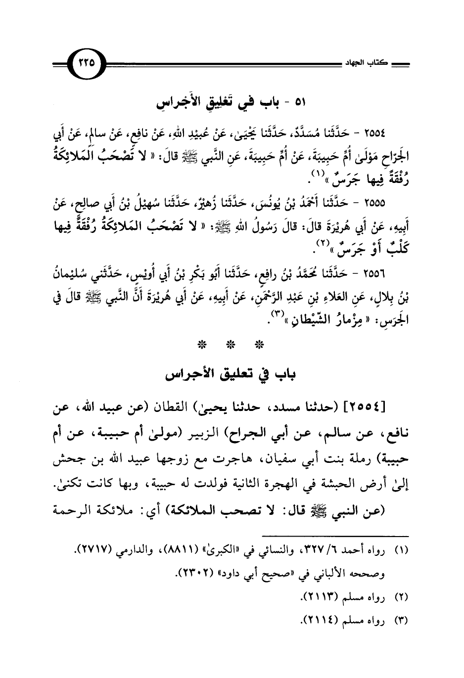 2554 - حَدَّثَنا مُسَدَّدٌ، حَدَّثَنا يَحْيَى، عَنْ عُبيْدِ اللهِ، عَنْ نافِعٍ، عَنْ سالِمٍ، عَنْ أَبي الجَرّاحِ مَوْلَى أُمِّ حَبِيبَةَ، عَنْ أُمِّ حَبِيبَةَ، عَنِ النَّبي - صلى الله عليه وسلم - قالَ: "لا تَصْحَبُ المَلائِكَةُ رُفْقَةً فِيها جَرَسٌ" (¬1).