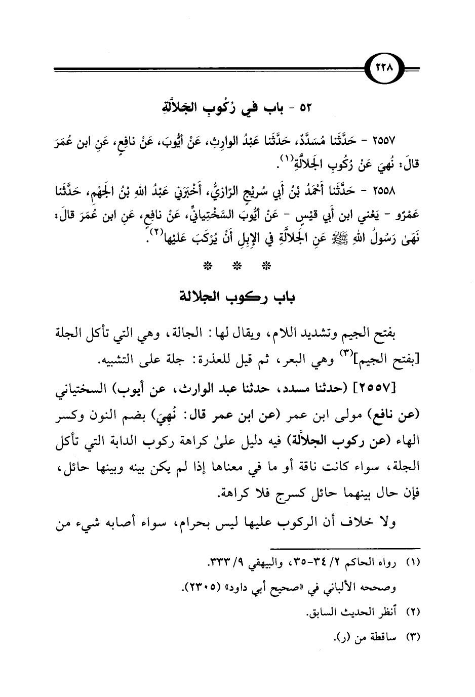 2557 - حَدَّثَنا مُسَدَّدٌ، حَدَّثَنا عَبْدُ الوارِثِ، عَنْ أيّوبَ، عَنْ نافِعٍ, عَنِ ابن عُمَرَ قالَ: نُهيَ عَنْ رُكُوبِ الجَلالَّةِ (¬1).