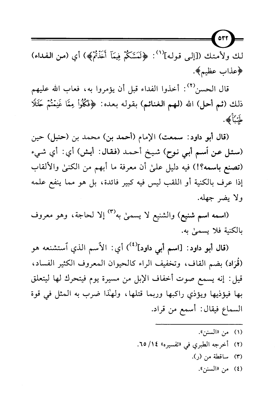 (قال أبو داود: [اسم أبي داود]) (¬4) أي: الاسم الذي استشنعه هو (قُرَاد) بضم القاف، وتخفيف الراء كالحيوان المعروف الكثير الفساد، قيل: إنه يسمع صوت أخفاف الإبل من مسيرة يوم فيتحرك لها ليتعلق بها فيؤذيها ويؤذي راكبها وربما قتلها، ولهذا ضرب به المثل في قوة السماع فيقال: أسمع من قراد.