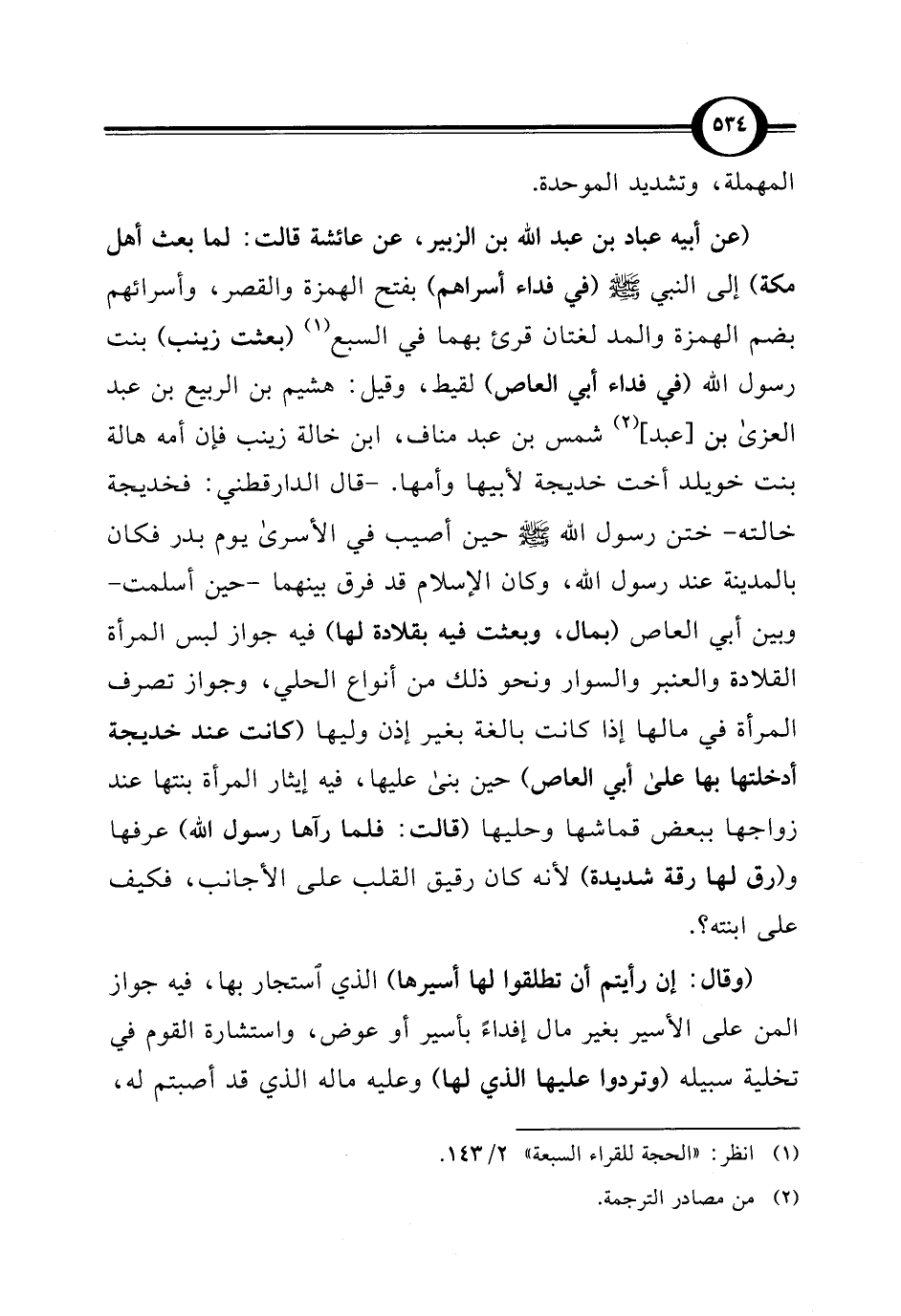 (عن أبيه عباد بن عبد الله بن الزبير، عن عائشة قالت: لما بعث أهل مكة) إلى النبي -صلى الله عليه وسلم- (في فداء أسراهم) بفتح الهمزة والقصر، وأسرائهم بضم الهمزة والمد لغتان قرئ بهما في السبع (¬1) (بعثت زينب) بنت رسول الله (في فداء أبي العاص) لقيط، وقيل: هشيم بن الربيع بن عبد العزى بن [عبد] (¬2) شمس بن عبد مناف، ابن خالة زينب فإن أمه هالة بنت خويلد أخت خديجة لأبيها وأمها. -قال الدارقطني: فخديجة خالته- ختن رسول الله -صلى الله عليه وسلم- حين أصيب في الأسرى يوم بدر فكان بالمدينة عند رسول الله، وكان الإسلام قد فرق بينهما -حين أسلمت- وبين أبي العاص (بمال، وبعثت فيه بقلادة لها) فيه جواز لبس المرأة القلادة والعنبر والسوار ونحو ذلك من أنواع الحلي، وجواز تصرف المرأة في مالها إذا كانت بالغة بغير إذن وليها (كانت عند خديجة أدخلتها بها على أبي العاص) حين بنى عليها، فيه إيثار المرأة بنتها عند زواجها ببعض قماشها وحليها (قالت: فلما رآها رسول الله) عرفها و (رق لها رقة شديدة) لأنه كان رقيق القلب على الأجانب، فكيف على ابنته؟ .
