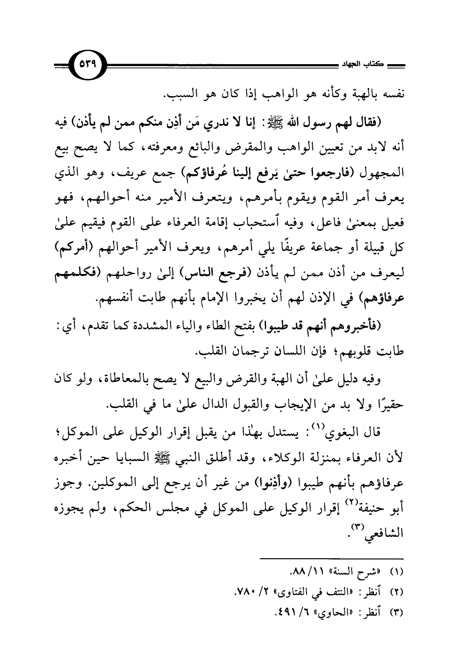 قال البغوي (¬1): يستدل بهذا من يقبل إقرار الوكيل على الموكل؛ لأن العرفاء بمنزلة الوكلاء، وقد أطلق النبي -صلى الله عليه وسلم- السبايا حين أخبره عرفاؤهم بأنهم طيبوا (وأذِنوا) من غير أن يرجع إلى الموكلين. وجوز أبو حنيفة (¬2) إقرار الوكيل على الموكل في مجلس الحكم، ولم يجوزه الشافعي (¬3).