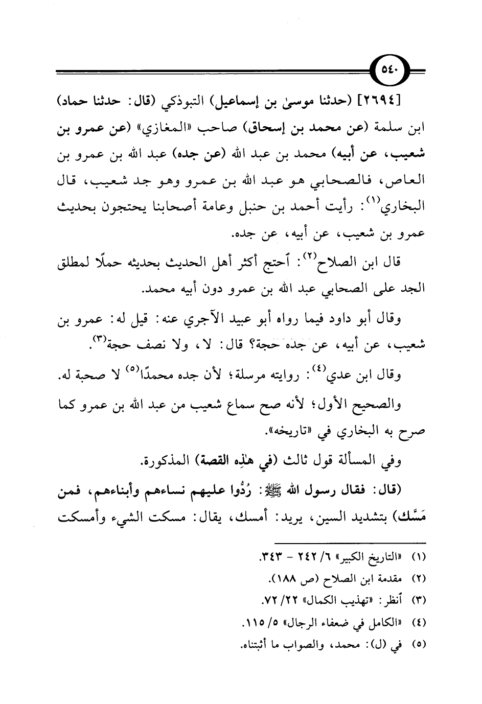 [2694] (حدثنا موسى بن إسماعيل) التبوذكي (قال: حدثنا حماد) ابن سلمة (عن محمد بن إسحاق) صاحب "المغازي" (عن عمرو بن شعيب، عن أبيه) محمد بن عبد الله (عن جده) عبد الله بن عمرو بن العاص، فالصحابي هو عبد الله بن عمرو وهو جد شعيب، قال البخاري (¬1): رأيت أحمد بن حنبل وعامة أصحابنا يحتجون بحديث عمرو بن شعيب، عن أبيه، عن جده.