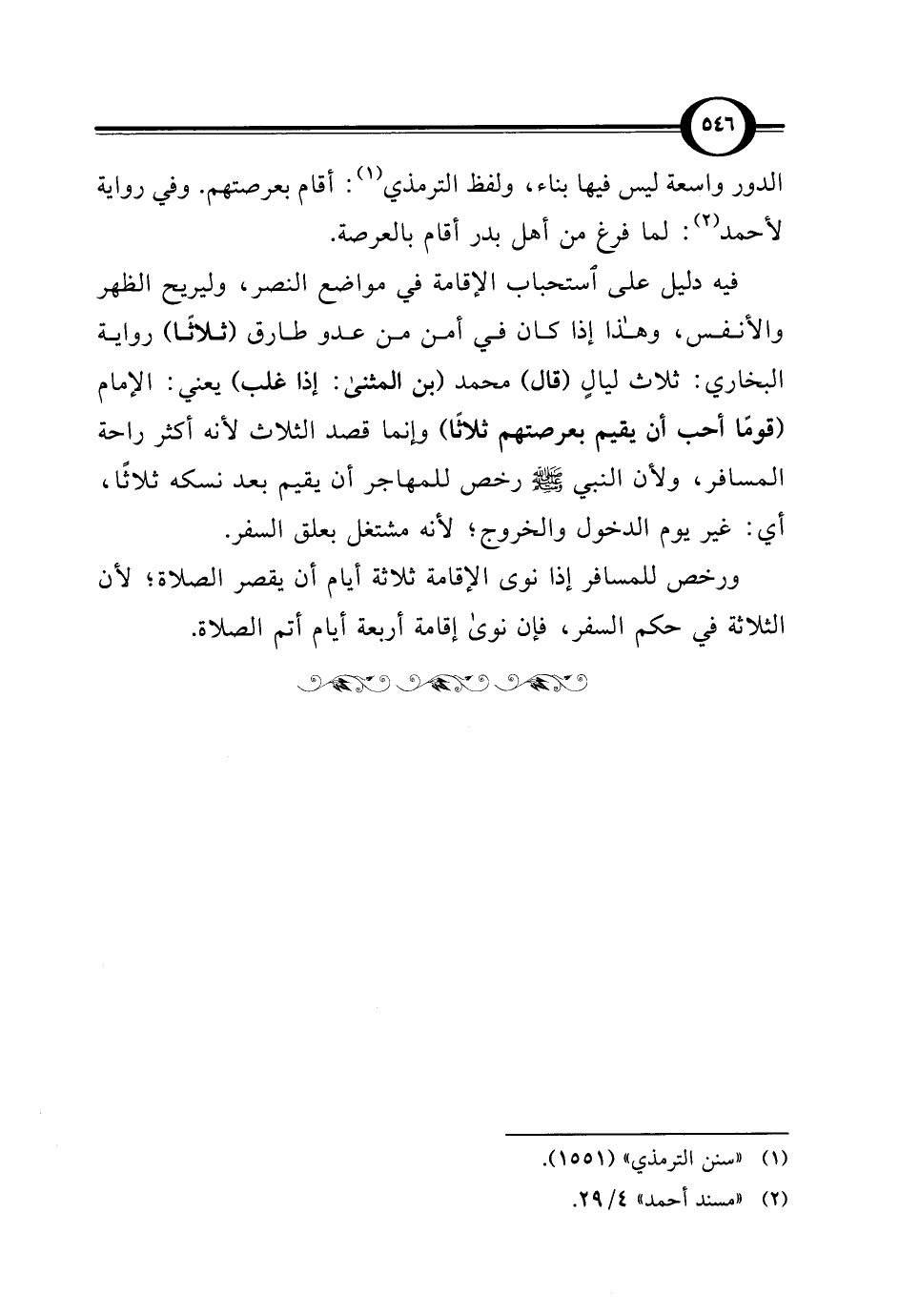 ورخص للمسافر إذا نوى الإقامة ثلاثة أيام أن يقصر الصلاة؛ لأن الثلاثة في حكم السفر، فإن نوى إقامة أربعة أيام أتم الصلاة.
