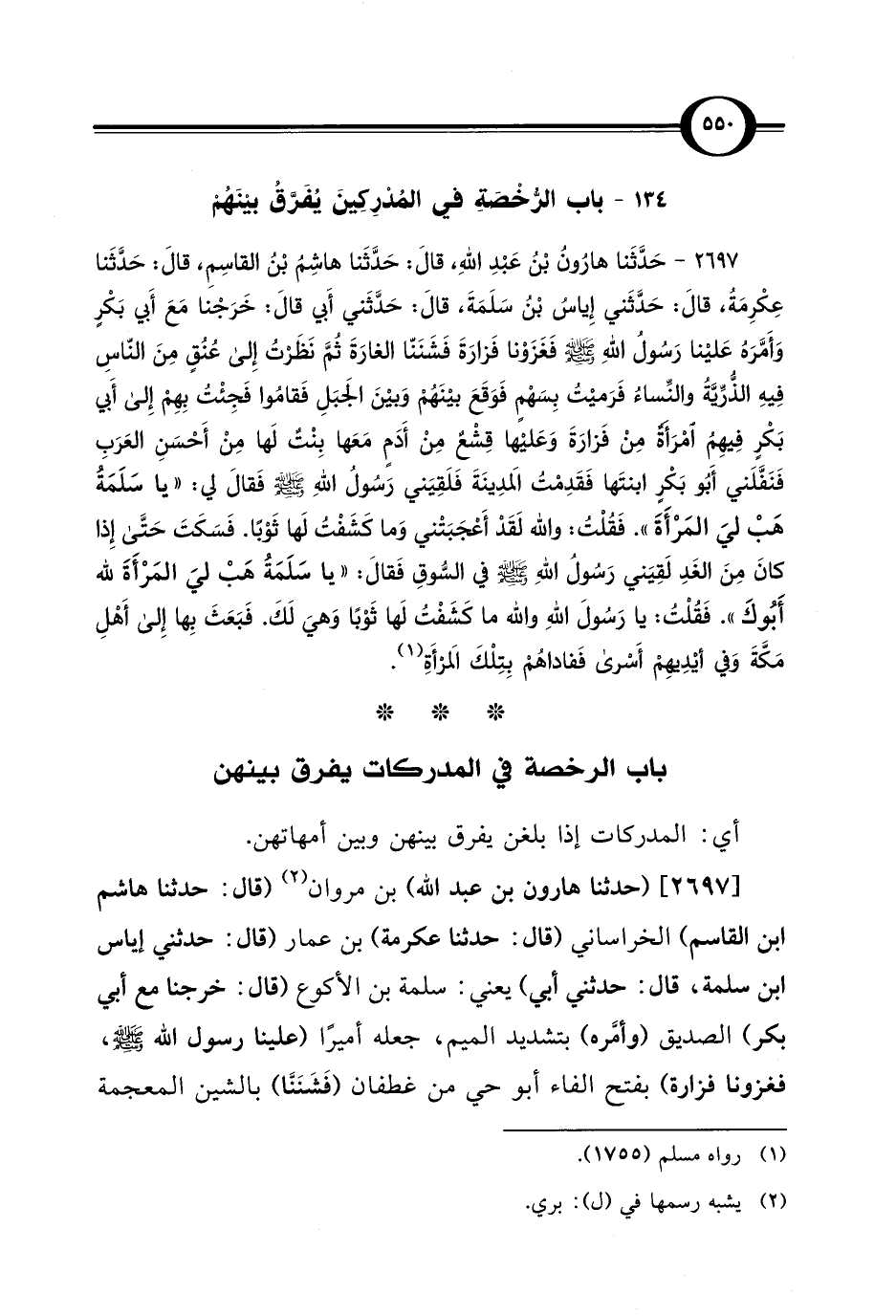 2697 - حَدَّثَنا هارُون بْنُ عَبْدِ اللهِ، قالَ: حَدَّثَنا هاشِم بْن القاسِمِ، قالَ: حَدَّثَنا عِكْرِمَةُ، قالَ: حَدَّثني إِياسُ بْن سَلَمَةَ، قالَ: حَدَّثَني أَبي قالَ: خَرَجْنا مَعَ أَبي بَكْرٍ وَأَمَّرَهُ عَليْنا رَسُولُ اللهِ - صلى الله عليه وسلم - فَغَزَوْنا فَزارَةَ فَشَنَنّا الغارَةَ ثمَّ نَظَرْتُ إِلى عُنُقٍ مِنَ النّاسِ فِيهِ الذُّرِّيَّةُ والنِّساء فَرَميْتُ بِسَهْمٍ فَوَقَعَ بيْنَهُمْ وَبيْنَ الجَبَلِ فَقامُوا فَجِئْتُ بِهِمْ إِلى أَبي بَكْرٍ فِيهِمُ امْرَأة مِنْ فَزارَةَ وَعَليْها قِشْعٌ مِنْ أَدَمٍ مَعَها بِنْتٌ لَها مِنْ أَحْسَنِ العَرَبِ فَنَفَّلَني أَبو بَكْرٍ ابنتَها فَقَدِمْت المَدِينَةَ فَلَقِيَني رَسولُ اللهِ - صلى الله عليه وسلم - فَقالَ لي: "يا سَلَمَةُ هَبْ ليَ المَرْأَةَ". فَقُلْت: والله لَقَدْ أَعْجَبَتْني وَما كَشَفْتُ لَها ثَوْبًا. فَسَكَتَ حَتَّى إِذا كانَ مِنَ الغَدِ لَقِيَني رَسُول اللهِ - صلى الله عليه وسلم - في السّوقِ فَقالَ: "يا سَلَمَةُ هَبْ ليَ المَرْأَةَ لله أَبُوكَ". فَقُلْتُ: يا رَسُولَ اللهِ والله ما كَشَفْتُ لَها ثَوْبًا وَهيَ لَكَ. فَبَعَثَ بِها إِلى أَهْلِ مَكَّةَ وَفي أيْدِيهمْ أَسْرى فَفاداهُمْ بِتِلْكَ المَرْأَةِ (¬1).