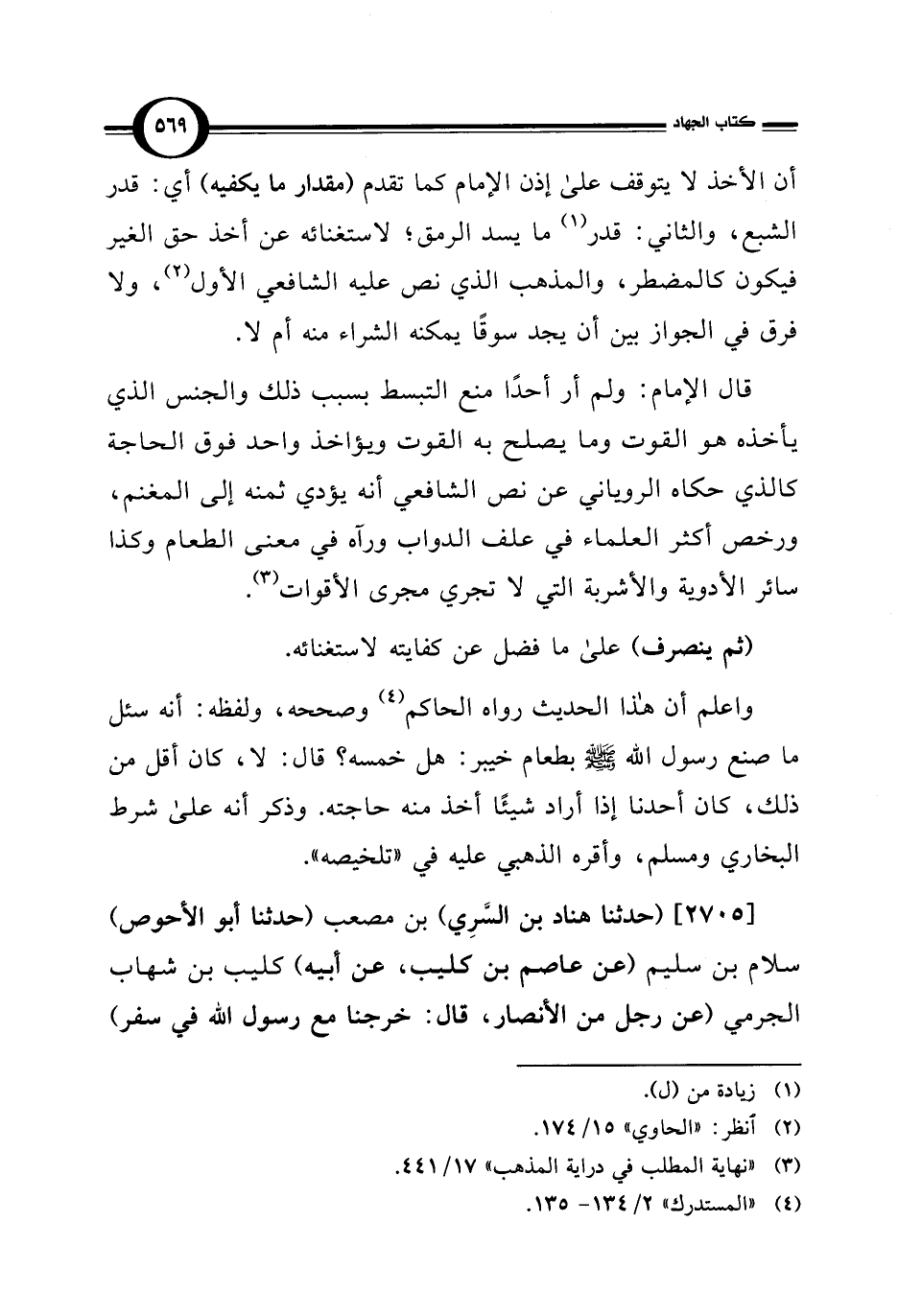 قال الإمام: ولم أر أحدًا منع التبسط بسبب ذلك والجنس الذي يأخذه هو القوت وما يصلح به القوت ويؤاخذ واحد فوق الحاجة كالذي حكاه الروياني عن نص الشافعي أنه يؤدي ثمنه إلى المغنم، ورخص أكثر العلماء في علف الدواب ورآه في معنى الطَّعام وكذا سائر الأدوية والأشربة التي لا تجري مجرى الأقوات (¬3).