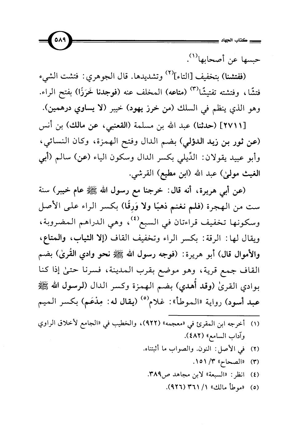 (عن أبي هريرة، أَنَّه قال: خرجنا مع رسول الله - صلى الله عليه وسلم - عام خيبر) سنة ست من الهجرة (فلم نغنم ذهباً ولا وَرِقاً) بكسر الراء على الأصل وسكونها تخفيف قراءتان في السبع (¬4)، وهي الدراهم المضروبة، ويقال لها: الرقة: بكسر الراء وتخفيف القاف (إلا الثياب، والمتاع، والأموال قال) أبو هريرة: (فوجه رسول الله - صلى الله عليه وسلم - نحو وادي القُرى) بضم القاف جمع قرية، وهو موضع بقرب المدينة، فسرنا حتى إذا كنا بوادي القرى (وقد أُهدي) بضم الهمزة وكسر الدال (لرسول الله - صلى الله عليه وسلم - عبد أسود) رواية "الموطأ": غلام (¬5) (يقال له: مِدْعَم) بكسر الميم