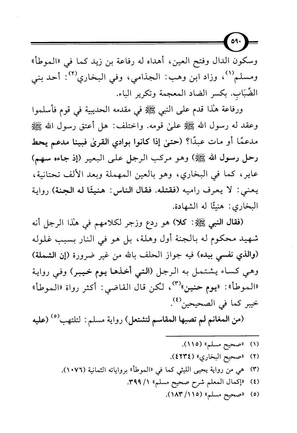 ورفاعة هذا قدم على النبي - صلى الله عليه وسلم - في مقدمه الحديبية في قوم فأسلموا وعقد له رسول الله - صلى الله عليه وسلم - على قومه. واختلف: هل أعتق رسول الله - صلى الله عليه وسلم - مدعمًا أو مات عبداً؟ (حتى إذا كانوا بوادي القرى فبينا مدعم يحط رحل رسول الله - صلى الله عليه وسلم -) وهو مركب الرجل على البعير (إذ جاءه سهم) عاير، كما في البخاري، وهو بالعين المهملة وبعد الألف تحتانية، يعني: لا يعرف راميه (فقتله. فقال الناس: هنيئا له الجنة) رواية البخاري: هنيئًا له الشهادة.