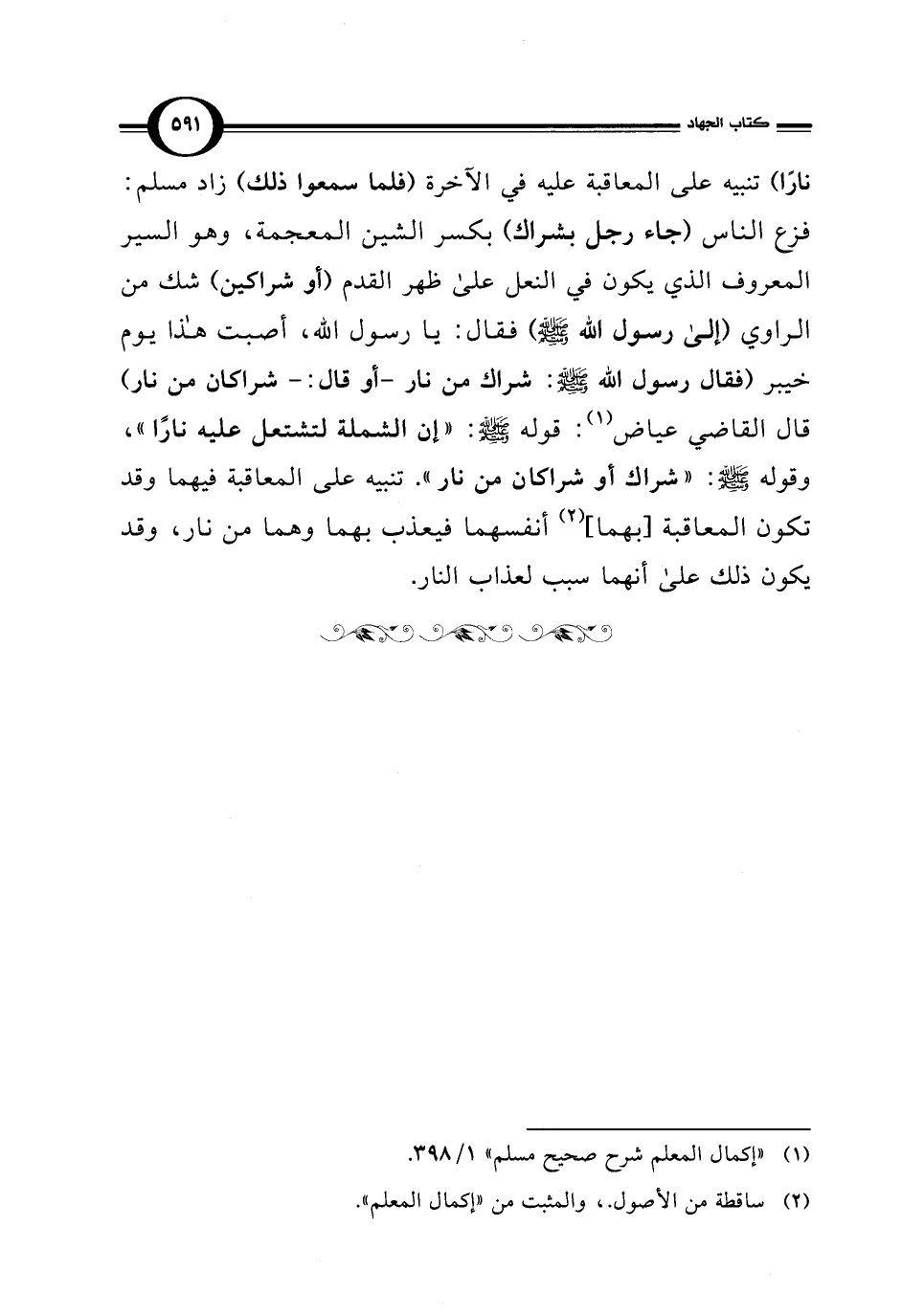 نارًا) تنبيه على المعاقبة عليه في الآخرة (فلما سمعوا ذلك) زاد مسلم: فزع الناس (جاء رجل بشراك) بكسر الشين المعجمة، وهو السير المعروف الذي يكون في النعل على ظهر القدم (أو شراكين) شك من الراوي (إلى رسول الله - صلى الله عليه وسلم -) فقال: يا رسول الله، أصبت هذا يوم خيبر (فقال رسول الله - صلى الله عليه وسلم -: شراك من نار -أو قال: - شراكان من نار) قال القاضي عياض (¬1): قوله - صلى الله عليه وسلم -: "إن الشملة لتشتعل عليه نارًا"، وقوله - صلى الله عليه وسلم -: "شراك أو شراكان من نار". تنبيه على المعاقبة فيهما وقد تكون المعاقبة [بهما] (¬2) أنفسهما فيعذب بهما وهما من نار، وقد يكون ذلك على أنَّهما سبب لعذاب النار.
