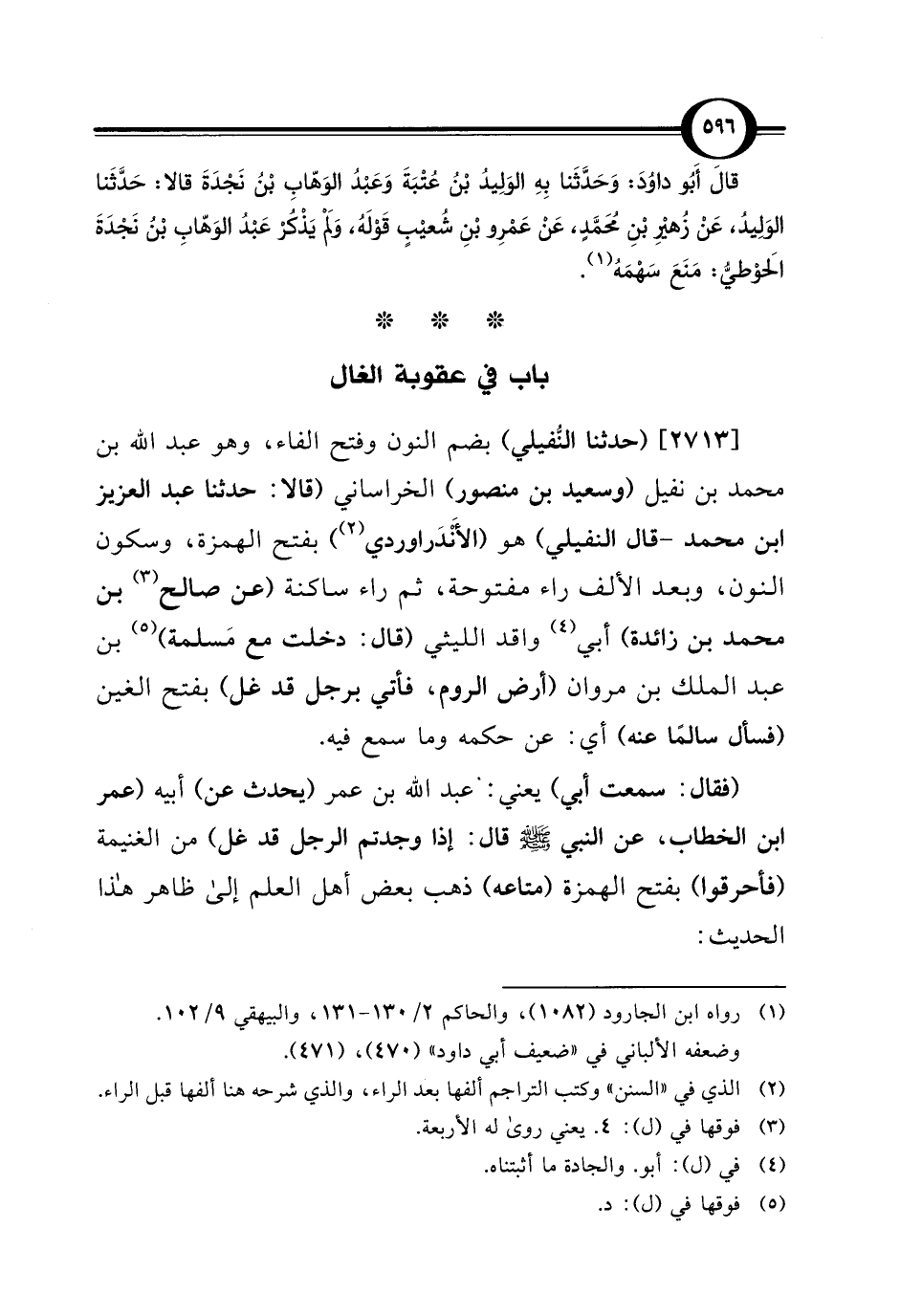[2713] (حدثنا النُّفيلي) بضم النون وفتح الفاء، وهو عبد الله بن محمد بن نفيل (وسعيد بن منصور) الخراساني (قالا: حدثنا عبد العزيز ابن محمد - قال النفيلي) هو (الأَنْدَراوردي) (¬2) بفتح الهمزة، وسكون النون، وبعد الألف راء مفتوحة، ثم راء ساكنة (عن صالح (¬3) بن محمد بن زائدة) أبي (¬4) واقد الليثي (قال: دخلت مع مَسلمة) (¬5) بن عبد الملك بن مروان (أرض الروم، فأتي برجل قد غل) بفتح الغين (فسأل سالمًا عنه) أي: عن حكمه وما سمع فيه.