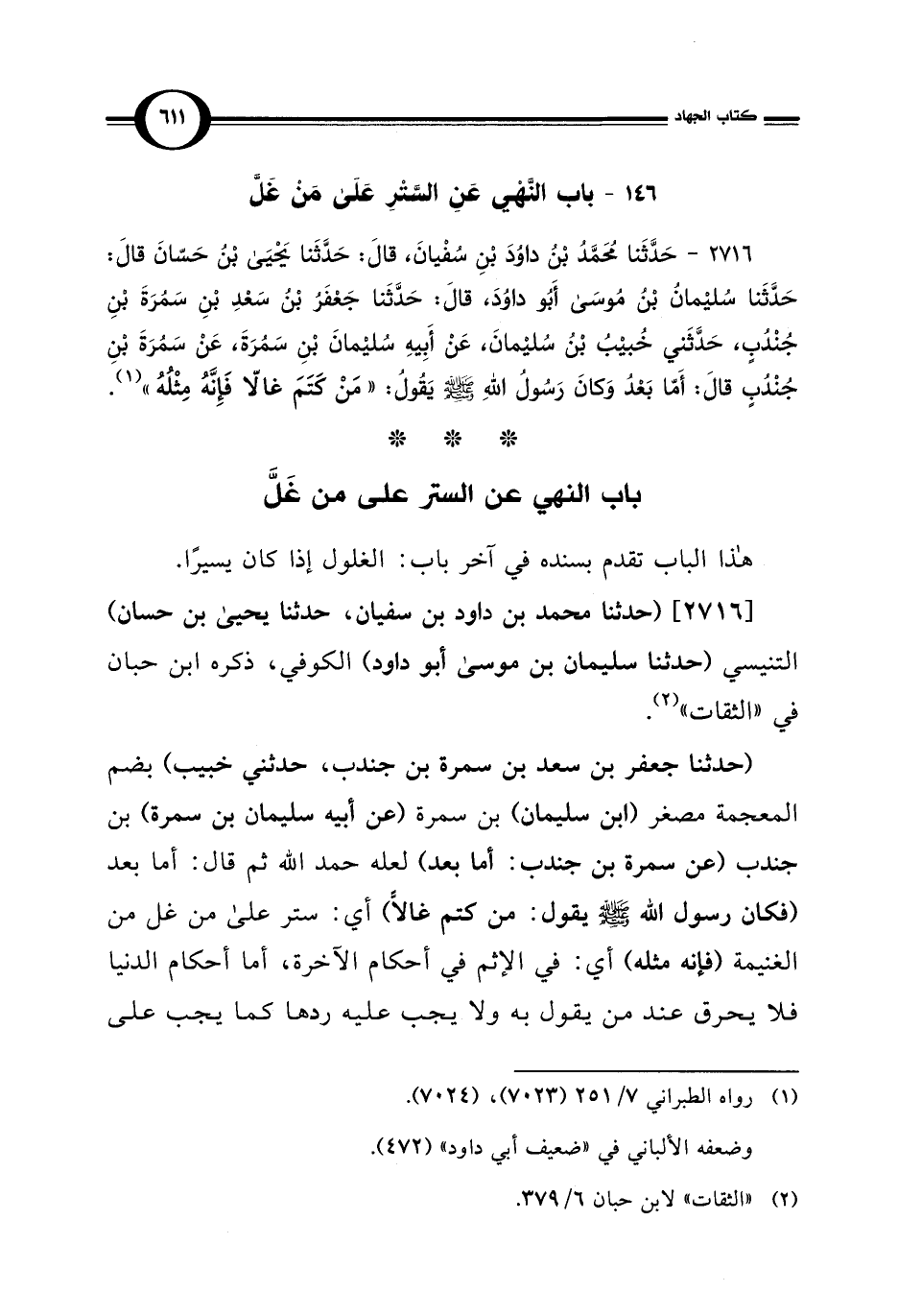 (حدثنا جعفر بن سعد بن سمرة بن جندب، حدثني خبيب) بضم المعجمة مصغر (ابن سليمان) بن سمرة (عن أبيه سليمان بن سمرة) بن جندب (عن سمرة بن جندب: أما بعد) لعله حمد الله ثم قال: أما بعد (فكان رسول الله - صلى الله عليه وسلم - يقول: من كتم غالاًّ) أي: ستر على من غل من الغنيمة (فإنه مثله) أي: في الإثم في أحكام الآخرة، أما أحكام الدنيا فلا يحرق عند من يقول به ولا يجب عليه ردها كما يجب على
