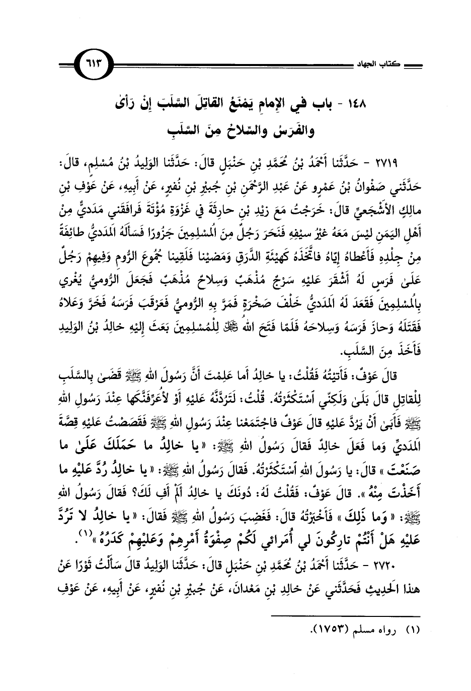 2719 - حَدَّثَنا أَحْمَدُ بْن محَمَّدِ بْنِ حَنْبَلٍ قالَ: حَدَّثَنا الوَلِيدُ بْنُ مُسْلِمٍ، قالَ: حَدَّثَني صَفْوان بْن عَمْرٍو عَنْ عَبْدِ الرَّحْمَنِ بْنِ جُبيْرِ نُفيرٍ، عَنْ أَبِيهِ، عَنْ عَوْفِ بْنِ مالِكٍ الأشجَعيِّ قالَ: خَرَجْت مَعَ زيْدِ بْنِ حارِثَةَ في غَزْوَةِ مُؤْتَةَ فَرافَقَني مَدَديٌّ مِنْ أَهْلِ اليَمَنِ ليْسَ مَعَهُ غيْرُ سيْفِهِ فَنَحَرَ رَجُلٌ مِنَ المُسْلِمِينَ جَزورًا فَسَأَلة المَدَديُّ طائِفَةً مِنْ جِلْدِهِ فَأَعطْاهُ إِيّاهُ فاتَّخَذَهُ كَهيْئَةِ الدَّرَقِ وَمَضيْنا فَلَقِينا جُمُوعَ الرُّومِ وَفِيهِمْ رَجُلٌ عَلَى فَرَسٍ لَهُ أَشْقَرَ عَليْهِ سَرجٌ فذْهَبٌ وَسِلاحٌ مُذْهَبٌ فَجَعَلَ الرُّوميُّ يُغْري بِالُمسْلِمِينَ فَقَعَدَ لَهُ المَدَديُّ خَلْفَ صَخْرَةٍ فَمَرَّ بِهِ الرُّوميّ فَعَرقَبَ فَرَسَهُ فَخَرَّ وَعَلاهُ فَقَتَلَهُ وَحازَ فَرَسَهُ وَسِلاحَهُ فَلَمّا فَتَحَ اللهُ - عز وجل - لِلْمُسْلِمِينَ بَعَثَ إِليْهِ خالِدُ بْنُ الوَلِيدِ فَأَخَذَ مِنَ السَّلَبِ.