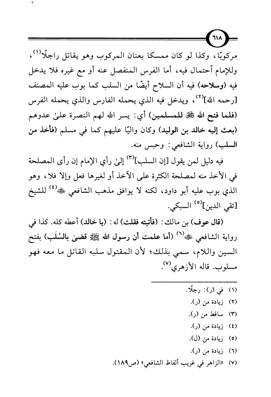 مركوبًا، وكذا لو كان ممسكا بعنان المركوب وهو يقاتل راجلًا (¬1)، وللإمام احتمال فيه، أما الفرس المنفصل عنه أو مع غيره فلا يدخل فيه (وسلاحه) فيه أن السلاح أيضًا من السلب كما بوب عليه المصنف [رحمه الله] (¬2)، ويدخل فيه الذي يحمله الفارس والذي يحمله الفرس (فلما فتح الله - عز وجل - للمسلمين) أي: يسر الله لهم النصرة على عدوهم (بعث إليه خالد بن الوليد) وكان واليًا عليهم كما في مسلم (فأخذ من السلب) رواية الشافعي: وحبس منه.
