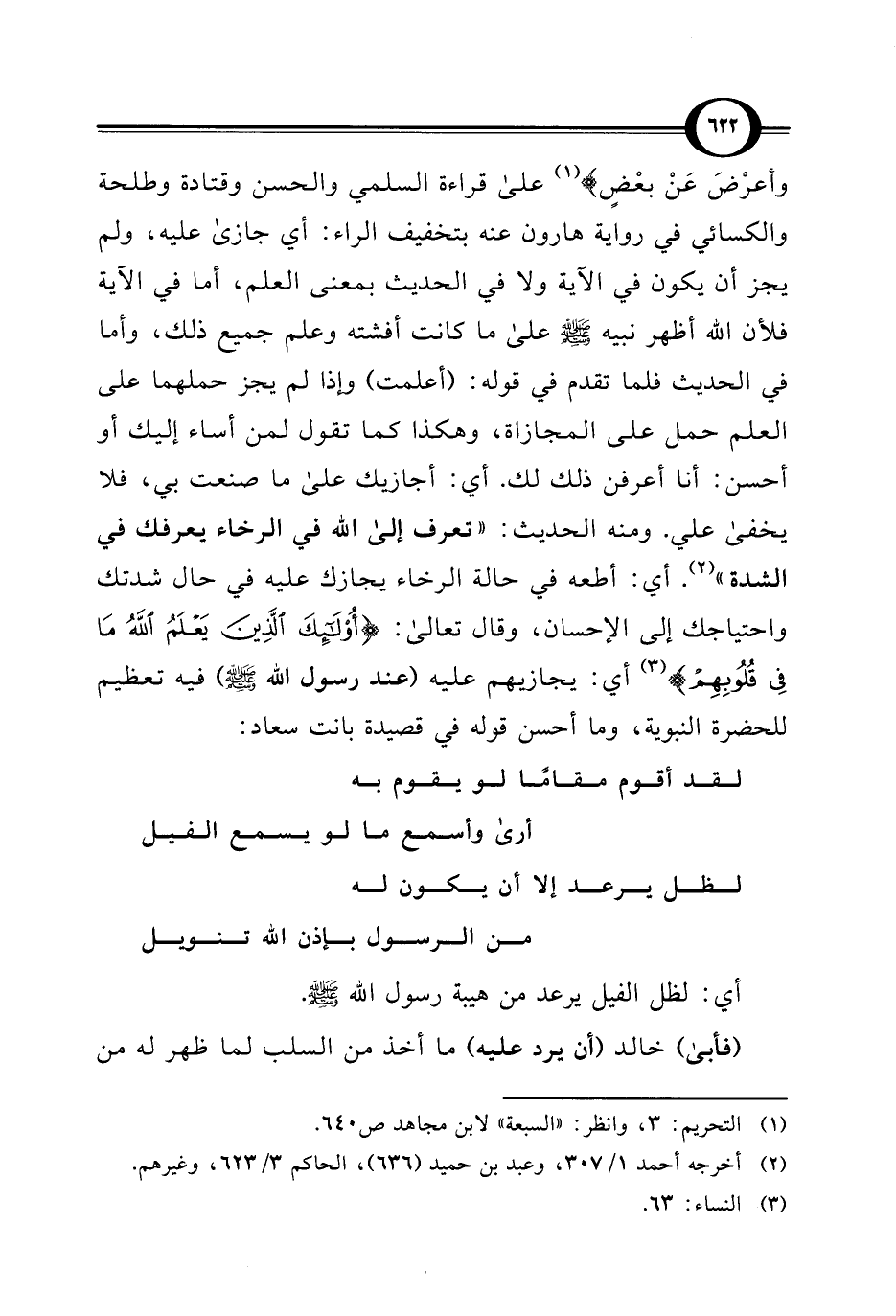 وَأَعْرَضَ عَنْ بَعْضٍ} (¬1) على قراءة السلمي والحسن وقتادة وطلحة والكسائي في رواية هارون عنه بتخفيف الراء: أي جازى عليه، ولم يجز أن يكون في الآية ولا في الحديث بمعنى العلم، أما في الآية فلأن الله أظهر نبيه - صلى الله عليه وسلم - على ما كانت أفشته وعلم جميع ذلك، وأما في الحديث فلما تقدم في قوله: (أعلمت) وإذا لم يجز حملهما على العلم حمل على المجازاة، وهكذا كما تقول لمن أساء إليك أو أحسن: أنا أعرفن ذلك لك. أي: أجازيك على ما صنعت بي، فلا يخفى علي. ومنه الحديث: "تعرف إلى الله في الرخاء يعرفك في الشدة" (¬2). أي: أطعه في حالة الرخاء يجازك عليه في حال شدتك واحتياجك إلى الإحسان، وقال تعالى: {أُولَئِكَ الَّذِينَ يَعْلَمُ اللَّهُ مَا فِي قُلُوبِهِمْ} (¬3) أي: يجازيهم عليه (عند رسول الله - صلى الله عليه وسلم -) فيه تعظيم للحضرة النبوية، وما أحسن قوله في قصيدة بانت سعاد: