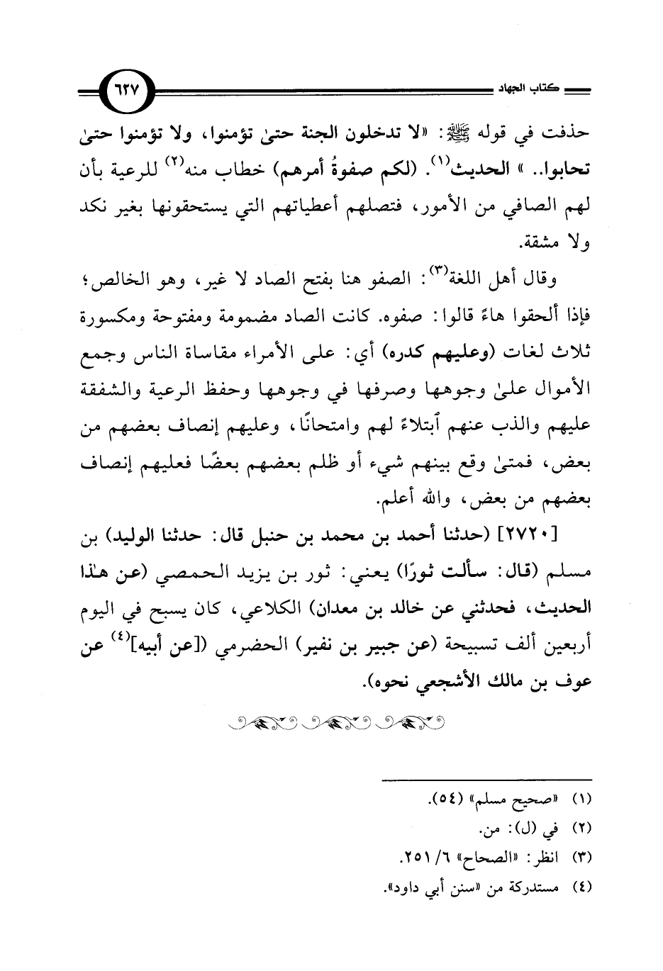 [2720] (حدثنا أحمد بن محمد بن حنبل قال: حدثنا الوليد) بن مسلم (قال: سألت ثورًا) يعني: ثور بن يزيد الحمصي (عن هذا الحديث، فحدثني عن خالد بن معدان) الكلاعي، كان يسبح في اليوم أربعين ألف تسبيحة (عن جبير بن نفير) الحضرمي ([عن أبيه] (¬4) عن عوف بن مالك الأشجعي نحوه).
