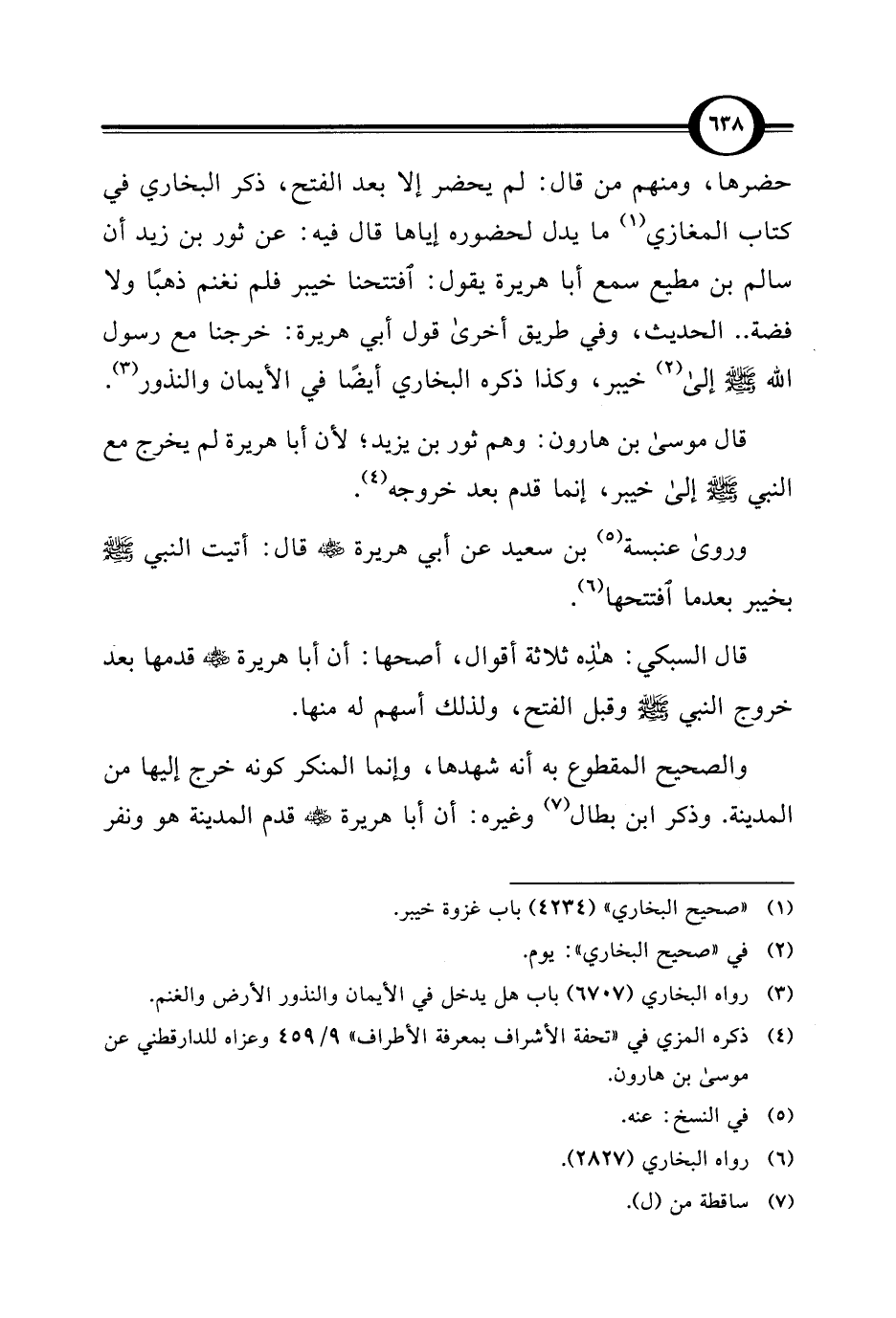 قال السبكي: هذِه ثلاثة أقوال، أصحها: أن أبا هريرة -رضي الله عنه - قدمها بعد خروج النبي - صلى الله عليه وسلم - وقبل الفتح، ولذلك أسهم له منها.