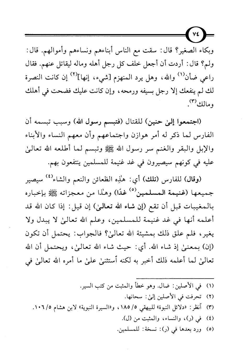 (اجتمعوا إلى حنين) للقتال (فتبسم رسول الله) وسبب تبسمه أن الفارس لما ذكر له أمر هوازن واجتماعهم وأن معهم النساء والأبناء والإبل والبقر والغنم سر رسول الله -صلى الله عليه وسلم- وتبسم لما أطلعه الله تعالى عليه في كونهم سيصيرون في غد غنيمة للمسلمين ينتفعون بهم.