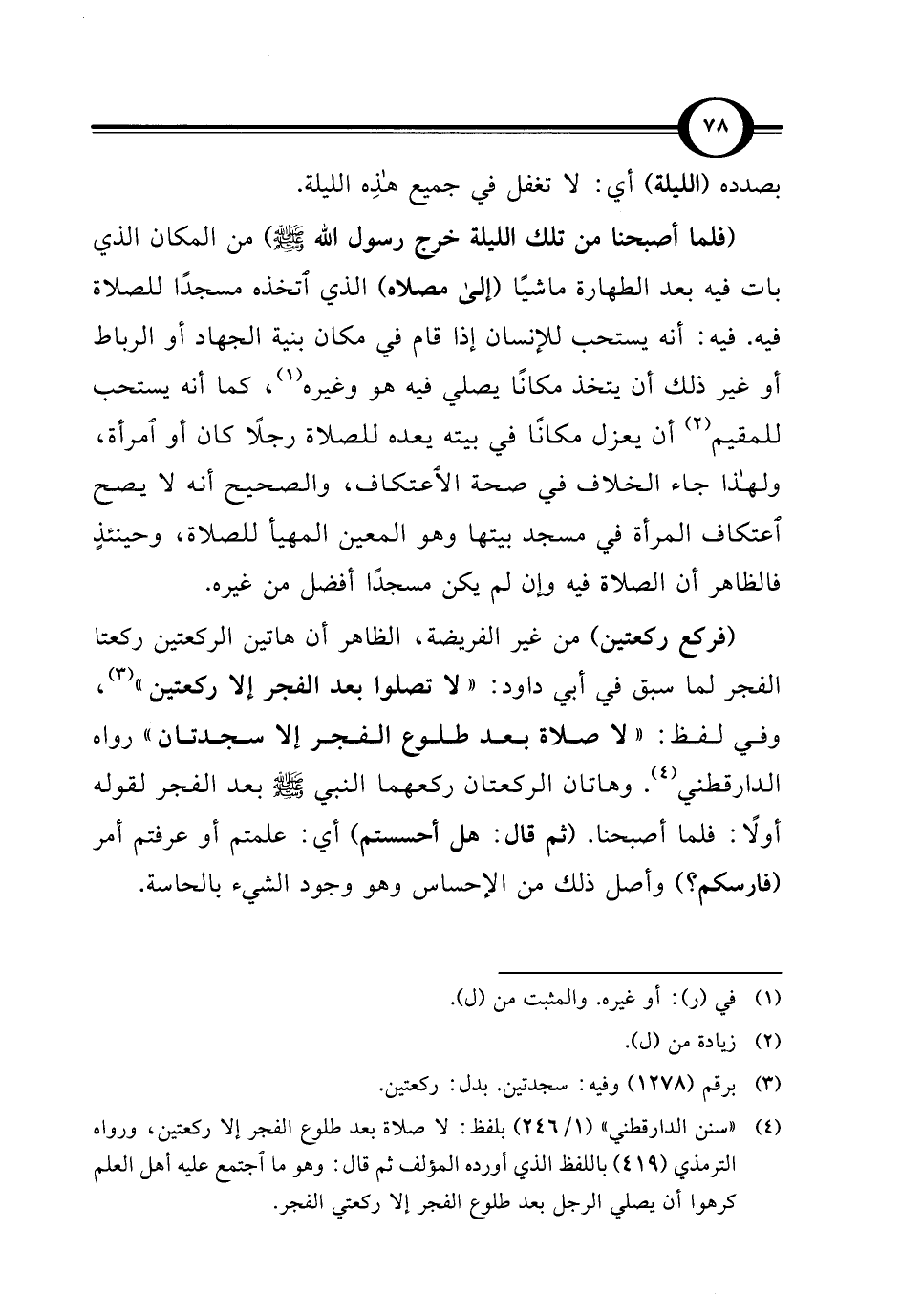 (فلما أصبحنا من تلك الليلة خرج رسول الله -صلى الله عليه وسلم-) من المكان الذي بات فيه بعد الطهارة ماشيًا (إلى مصلاه) الذي اتخذه مسجدًا للصلاة فيه. فيه: أنه يستحب للإنسان إذا قام في مكان بنية الجهاد أو الرباط أو غير ذلك أن يتخذ مكانًا يصلي فيه هو وغيره (¬1)، كما أنه يستحب للمقيم (¬2) أن يعزل مكانًا في بيته يعده للصلاة رجلًا كان أو امرأة، ولهذا جاء الخلاف في صحة الاعتكاف، والصحيح أنه لا يصح اعتكاف المرأة في مسجد بيتها وهو المعين المهيأ للصلاة، وحينئذٍ فالظاهر أن الصلاة فيه وإن لم يكن مسجدًا أفضل من غيره.