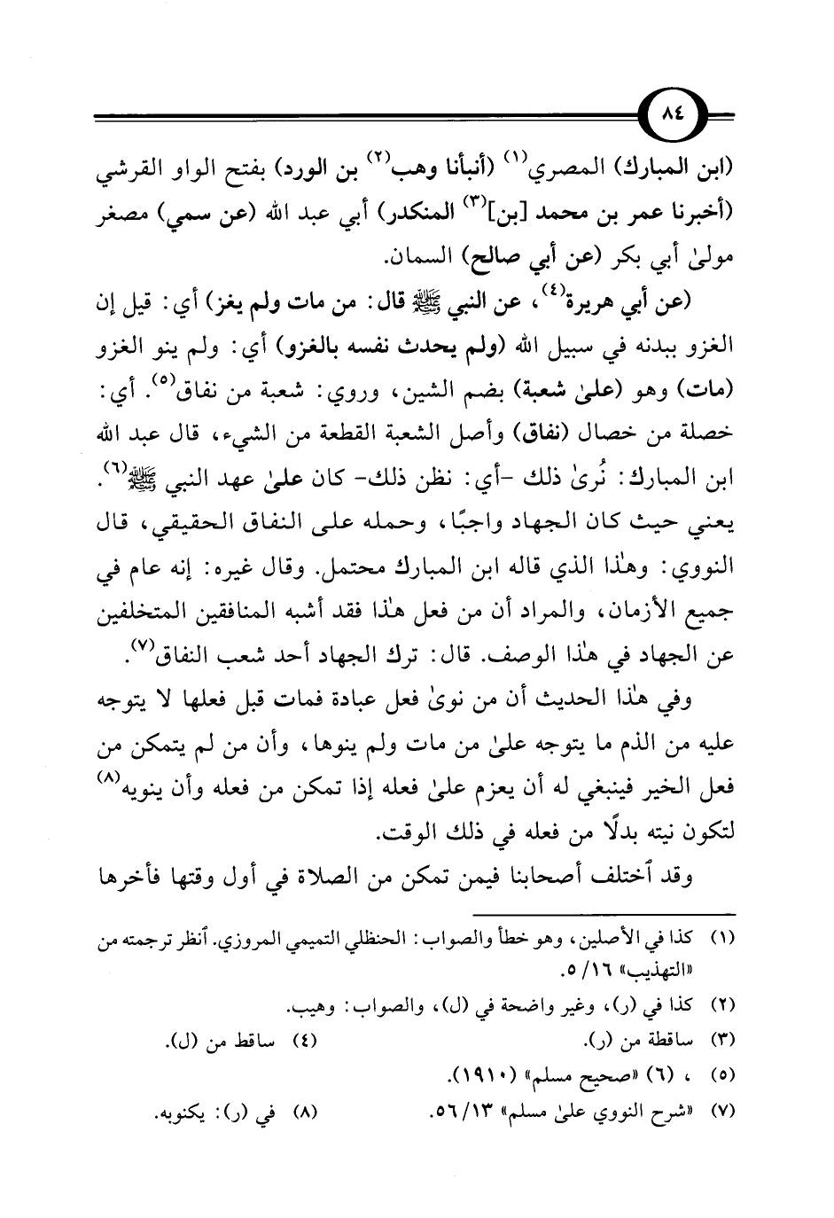 (عن أبي هريرة (¬4)، عن النبي -صلى الله عليه وسلم- قال: من مات ولم يغز) أي: قيل إن الغزو ببدنه في سبيل الله (ولم يحدث نفسه بالغزو) أي: ولم ينو الغزو (مات) وهو (على شعبة) بضم الشين، وروي: شعبة من نفاق (¬5). أي: خصلة من خصال (نفاق) وأصل الشعبة القطعة من الشيء، قال عبد الله ابن المبارك: نُرى ذلك -أي: نظن ذلك- كان على عهد النبي -صلى الله عليه وسلم- (¬6). يعني حيث كان الجهاد واجبًا، وحمله على النفاق الحقيقي، قال النووي: وهذا الذي قاله ابن المبارك محتمل. وقال غيره: إنه عام في جميع الأزمان، والمراد أن من فعل هذا فقد أشبه المنافقين المتخلفين عن الجهاد في هذا الوصف. قال: ترك الجهاد أحد شعب النفاق (¬7).