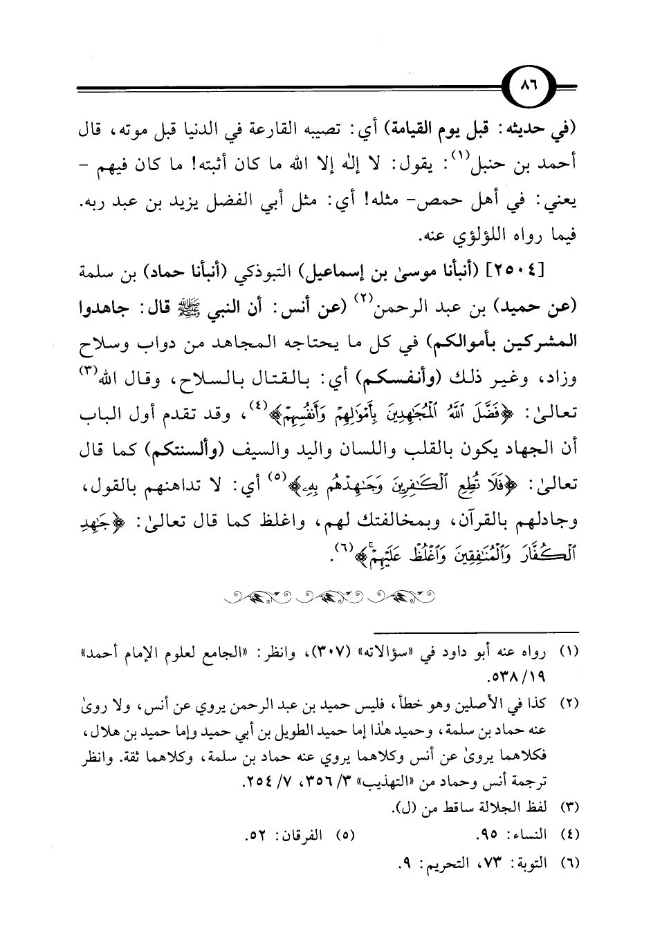 [2504] (أنبأنا موسى بن إسماعيل) التبوذكي (أنبأنا حماد) بن سلمة (عن حميد) بن عبد الرحمن (¬2) (عن أنس: أن النبي -صلى الله عليه وسلم- قال: جاهدوا المشركين بأموالكم) في كل ما يحتاجه المجاهد من دواب وسلاح وزاد، وغير ذلك (وأنفسكم) أي: بالقتال بالسلاح، وقال الله (¬3) تعالى: {فَضَّلَ اللَّهُ الْمُجَاهِدِينَ بِأَمْوَالِهِمْ وَأَنْفُسِهِمْ} (¬4)، وقد تقدم أول الباب أن الجهاد يكون بالقلب واللسان واليد والسيف (وألسنتكم) كما قال تعالى: {فَلَا تُطِعِ الْكَافِرِينَ وَجَاهِدْهُمْ بِهِ} (¬5) أي: لا تداهنهم بالقول، وجادلهم بالقرآن، وبمخالفتك لهم، واغلظ كما قال تعالى: {جَاهِدِ الْكُفَّارَ وَالْمُنَافِقِينَ وَاغْلُظْ عَلَيْهِمْ} (¬6).