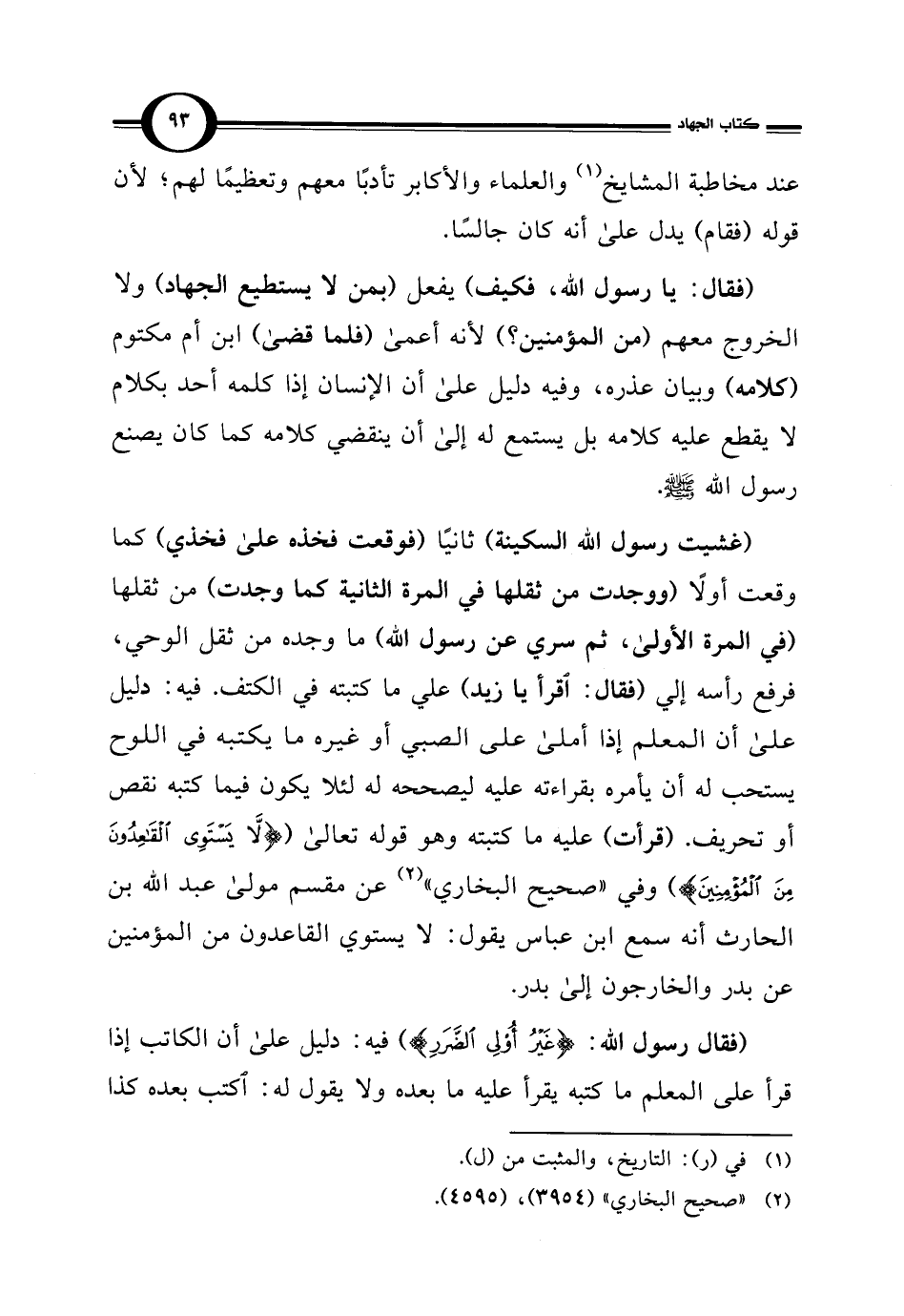 (فقال رسول الله: {غَيْرُ أُولِي الضَّرَرِ}) فيه: دليل على أن الكاتب إذا قرأ على المعلم ما كتبه يقرأ عليه ما بعده ولا يقول له: اكتب بعده كذا