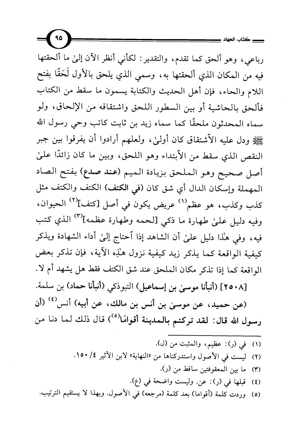 رباعي، وهو ألحق كما تقدم، والتقدير: لكأني أنظر الآن إلى ما ألحقتها فيه من المكان الذي ألحقتها به، وسمي الذي يلحق بالأول لَحَقًا بفتح اللام والحاء، فإن أهل الحديث والكتابة يسمون ما سقط من الكتاب فألحق بالحاشية أو بين السطور اللحق واشتقاقه من الإلحاق، ولو سماه المحدثون ملحقًا كما سماه زيد بن ثابت كاتب وحي رسول الله -صلى الله عليه وسلم- ودل عليه الاشتقاق كان أولى، ولعلهم أرادوا أن يفرقوا بين جبر النقص الذي سقط من الابتداء وهو اللحق، وبين ما كان زائدًا على أصل صحيح وهو الملحق بزيادة الميم (عند صدع) بفتح الصاد المهملة وإسكان الدال أي شق كان (في الكتف) الكتف والكتف مثل كذب وكذب، هو عظم (¬1) عريض يكون في أصل [كتف] (¬2) الحيوان، وفيه دليل على طهارة ما ذكي [لحمه وطهارة عظمه] (¬3) الذي كتب فيه، وفي هذا دليل على أن الشاهد إذا احتاج إلى أداء الشهادة ويذكر كيفية الواقعة كما يذكر زيد كيفية نزول هذِه الآية، فإن تذكر بعض الواقعة كما إذا تذكر مكان الملحق عند شق الكتف فقط هل يشهد أم لا.