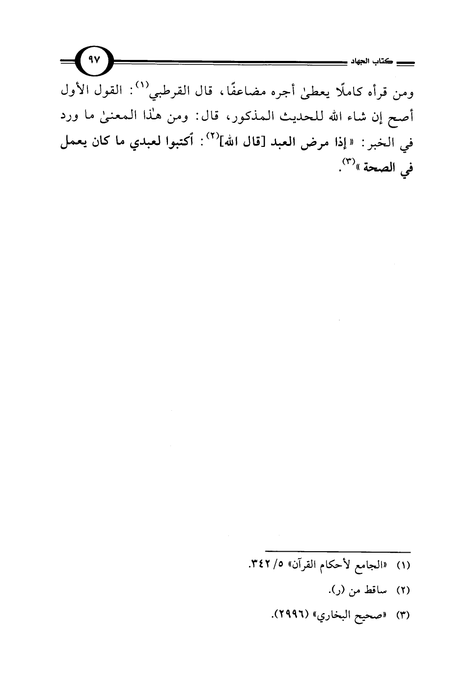 ومن قرأه كاملًا يعطى أجره مضاعفًا، قال القرطبي (¬1): القول الأول أصح إن شاء الله للحديث المذكور، قال: ومن هذا المعنى ما ورد في الخبر: "إذا مرض العبد [قال الله] (¬2): اكتبوا لعبدي ما كان يعمل في الصحة" (¬3).