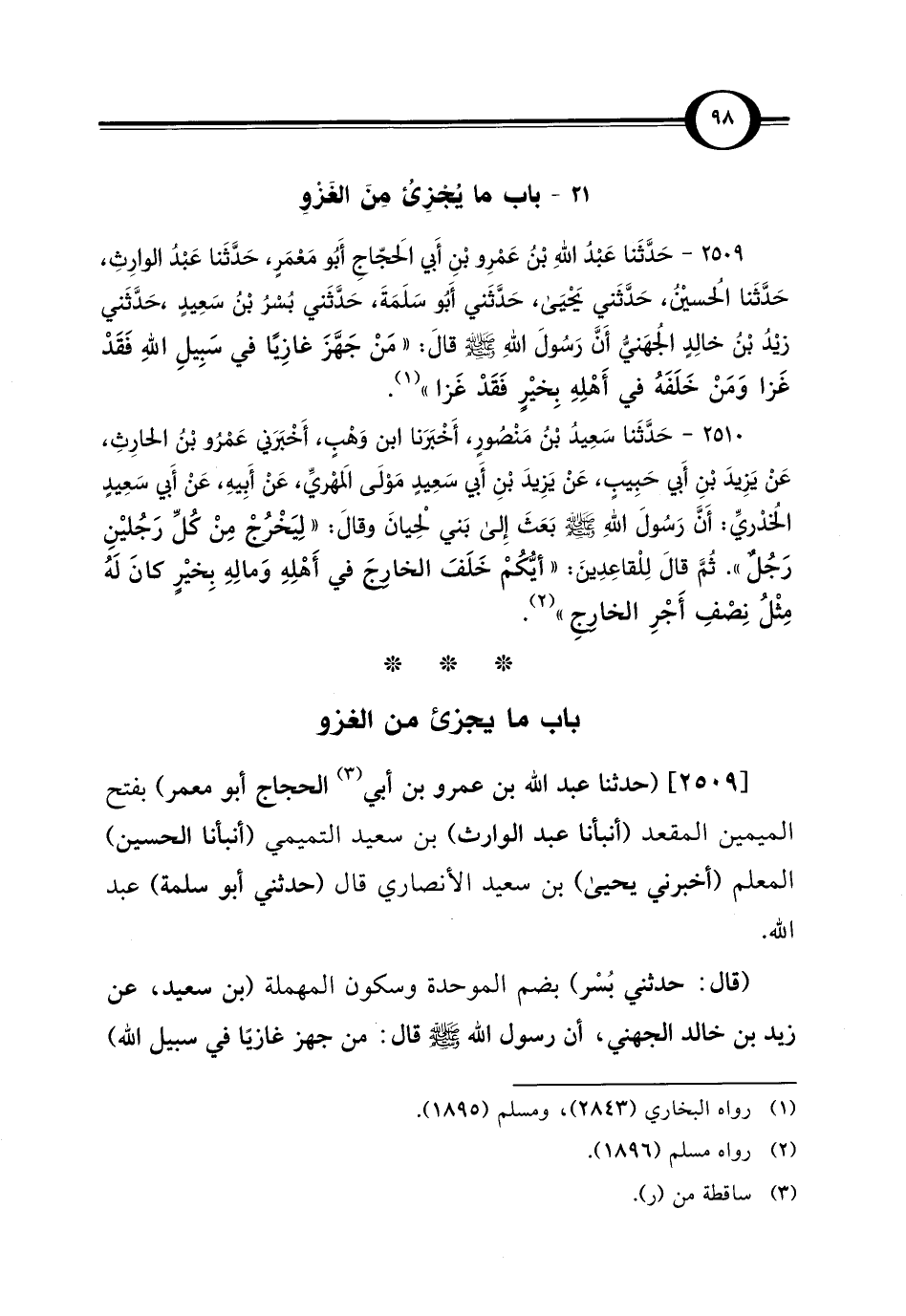 (قال: حدثني بُسْر) بضم الموحدة وسكون المهملة (بن سعيد، عن زيد بن خالد الجهني، أن رسول الله -صلى الله عليه وسلم- قال: من جهز غازيًا في سبيل الله)