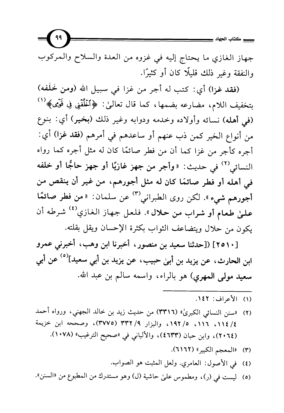 [2510] ([حدثنا سعيد بن منصور، أخبرنا ابن وهب، أخبرني عمرو ابن الحارث، عن يزيد بن أبي حبيب، عن يزيد بن أبي سعيد] (¬5) عن أبي سعيد مولى المهري) هو بالراء، واسمه سالم بن عبد الله.
