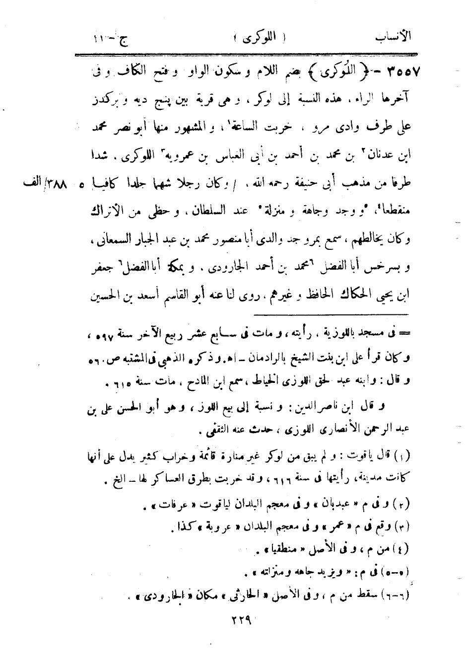 بضم اللام وسكون الواو وفتح الكاف وفي آخرها الراء، هذه النسبة إلى لوكر، وهي قرية بين پنج ديه وبركدز على طرف وادي مرو، خربت الساعة [1] ، والمشهور منها أبو نصر محمد ابن عدنان [2] بن محمد بن أحمد بن أبى العباس بن عمرويه [3] اللوكرى، شدا طرفا من مذهب أبى حنيفة رحمه الله،/ وكان رجلا شهما جلدا كافيا منقطعا [4] ، [5] ووجد وجاهة ومنزلة [5] عند السلطان، وحظي من الأتراك وكان يخالطهم، سمع بمرو جد والدي أبا منصور محمد بن عبد الجبار السمعاني، وبسرخس أبا الفضل [6] محمد بن أحمد الجارودي، وبمكة أبا الفضل [6] جعفر ابن يحيى الحكاك الحافظ وغيرهم، روى لنا عنه أبو القاسم أسعد بن الحسين