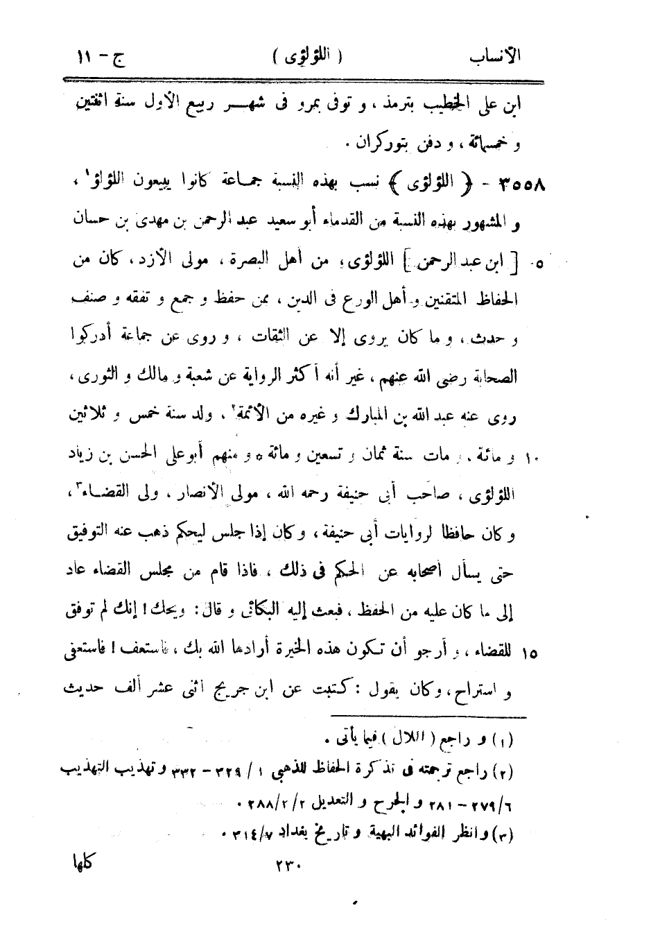 نسب بهذه النسبة جماعة كانوا يبيعون اللؤلؤ [1] ، والمشهور بهذه النسبة من القدماء أبو سعيد عبد الرحمن بن مهدي بن حسان [ابن عبد الرحمن] اللؤلؤي، من أهل البصرة، مولى الأزد، كان من الحفاظ المتقنين وأهل الورع في الدين، ممن حفظ وجمع وتفقه وصنف وحدث، وما كان يروى إلا عن الثقات، وروى عن جماعة أدركوا الصحابة رضى الله عنهم، غير أنه أكثر الرواية عن شعبة ومالك والثوري، روى عنه عبد الله بن المبارك وغيره من الأئمة [2] ، ولد سنة خمس وثلاثين ومائة، ومات سنة ثمان وتسعين ومائة ومنهم أبو على الحسن بن زياد اللؤلؤي، صاحب أبى حنيفة رحمه الله، مولى الأنصار، ولى القضاء [3] ، وكان حافظا لروايات أبى حنيفة، وكان إذا جلس ليحكم ذهب عنه التوفيق حتى يسأل أصحابه عن الحكم في ذلك، فإذا قام من مجلس القضاء عاد إلى ما كان عليه من الحفظ، فبعث إليه البكائي وقال: ويحك! إنك لم توفق للقضاء، وأرجو أن تكون هذه الخيرة أرادها الله بك، فاستعف! فاستعفى واستراح، وكان يقول: كتبت عن ابن جريج اثنى عشر ألف حديث