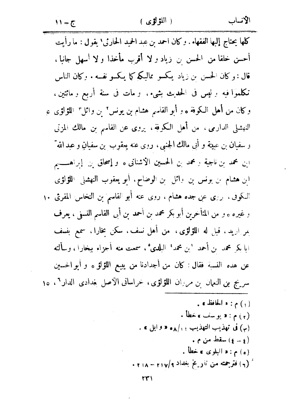 كلها يحتاج إليها الفقهاء، وكان أحمد بن عبد الحميد الحارثي [1] يقول: ما رأيت أحسن خلقا من الحسن بن زياد ولا أقرب مأخذا ولا أسهل جانبا، قال: وكان الحسن بن زياد يكسو مماليكه كما يكسو نفسه. وكان الناس تكلموا فيه وليس في الحديث بشيء، ومات في سنة أربع ومائتين، وكان من أهل الكوفة وأبو القاسم هشام بن يونس [2] بن وائل [3] اللؤلؤي النهشلي الدارميّ، من أهل الكوفة، يروى عن القاسم بن مالك المزني وسفيان بن عيينة وأبى مالك الجنبي، روى عنه يعقوب بن سفيان وعبد الله ابن محمد بن ناجية ومحمد بن الحسين الأشناني وإسحاق بن إبراهيم ابن هشام بن يونس بن وائل بن الوضاح، أبو يعقوب النهشلي اللؤلؤي الكوفي، يروى عن جده هشام، روى عنه أبو القاسم بن النخاس المقرئ وغيره ومن المتأخرين أبو بكر محمد بن أحمد بن أبى القاسم النسفي، يعرف بمرواريد، قيل له اللؤلؤي، من أهل نسف، سكن بخارا، سمع بنسف أبا بكر محمد بن أحمد [4] بن محمد [4] البلدي [5] ، سمعت منه أجزاء ببخارا، وسألته عن هذه النسبة فقال: كان من أجدادنا من يبيع اللؤلؤ وأبو الحسين سريج بن النعمان بن مروان اللؤلؤي، خراسانى الأصل بغدادي الدار [6] ،