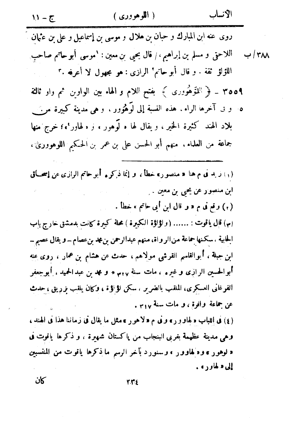 [4] في اللباب «لهاوور» وفي م «لاهور» مثل ما يقال في زماننا هذا في الهند، وهي مدينة عظيمة بغربي البنجاب من پاكستان شهيرة، وذكرها ياقوت في «لوهور» و «لهاوور» وسنورد بآخر الرسم ما ذكرها ياقوت من المنتسبين إلى «لهاور» .