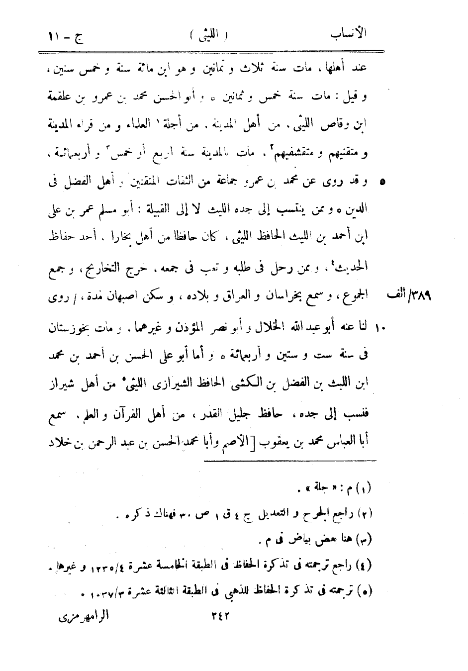 عند أهلها، مات سنة ثلاث وثمانين وهو ابن مائة سنة وخمس سنين، وقيل: مات سنة خمس وثمانين وأبو الحسن محمد بن عمرو بن علقمة ابن وقاص الليثي، من أهل المدينة، من أجلة [1] العلماء ومن قراء المدينة ومتقنيهم ومتقشفيهم [2] ، مات بالمدينة سنة أربع أو خمس [3] وأربعمائة، وقد روى عن محمد بن عمرو جماعة من الثقات المتقنين وأهل الفضل في الدين وممن ينتسب إلى جده الليث لا إلى القبيلة: أبو مسلم عمر بن على ابن أحمد بن الليث الحافظ الليثي، كان حافظا من أهل بخارا، أحد حفاظ الحديث [4] ، وممن رحل في طلبه وتعب في جمعه، خرج التخاريج، وجمع الجموع، وسمع بخراسان والعراق وبلاده، وسكن أصبهان مدة،/ روى لنا عنه أبو عبد الله الخلال وأبو نصر المؤذن وغيرهما، ومات بخوزستان في سنة ست وستين وأربعمائة وأما أبو على الحسن بن أحمد بن محمد ابن الليث بن الفضل بن الكشي الحافظ الشيرازي الليثي [5] من أهل شيراز فنسب إلى جده، حافظ جليل القدر، من أهل القرآن والعلم، سمع أبا العباس محمد بن يعقوب [الأصم وأبا محمد الحسن بن عبد الرحمن بن خلاد