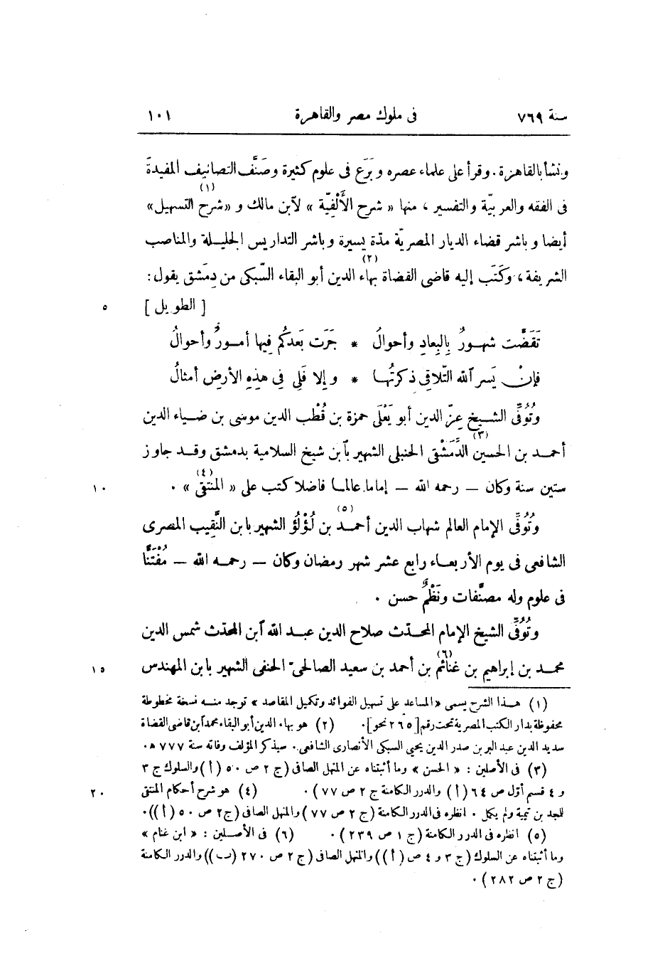 وتوفّى الإمام العالم شهاب الدين أحمد «5» بن لؤلؤ الشهير بابن النّقيب المصرى الشافعى في يوم الأربعاء رابع عشر شهر رمضان وكان- رحمه الله- مفتنّا فى علوم وله مصنّفات ونظم حسن.