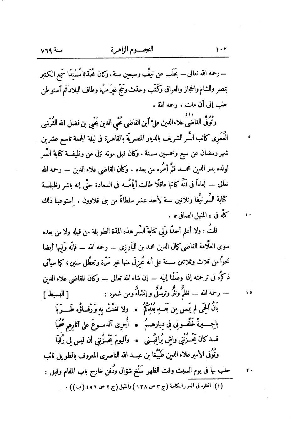 وتوفّى القاضى «1» علاء الدين علىّ ابن القاضى محيى الدين يحيى بن فضل الله القرشى العمرى كاتب السّر الشريف بالديار المصريّة بالقاهرة في ليلة الجمعة تاسع عشرين شهر رمضان عن سبع وخمسين سنة. وكان قبل موته نزل عن وظيفة كتابة السّر لولده بدر الدين محمد فتمّ أمره من بعده. وكان القاضى علاء الدين- رحمه الله تعالى- إماما في فنّه كاتبا عاقلا طالت أيّامه في السعادة حتّى إنه باشر وظيفة كتابة السّر نيّفا وثلاثين سنة لأحد عشر سلطانا من بنى قلاوون. استوعبنا ذلك كلّه فى «المنهل الصافى» .