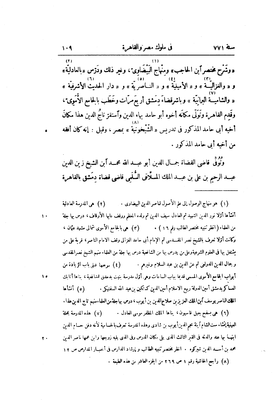 «وشرح مختصر ابن الحاجب» ومنهاج «1» البيضاوىّ، وغير ذلك ودرّس «بالعادليّة «2» » و «والغزاليّة «3» » و «الأمينيّة «4» » و «الناصريّة «5» » و «دار الحديث «6» الأشرفيّة» «والشامية»