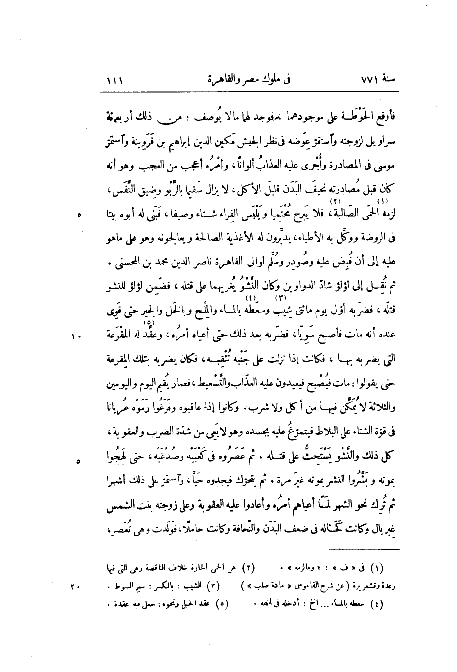 فأوقع الحوطة على موجودهما، فوجد لهما ما لا يوصف: من ذلك أربعمائة سراويل لزوجته واستقرّ عوضه في نظر الجيش مكين الدين إبراهيم بن قروينة واستمرّ موسى في المصادرة وأجرى عليه العذاب ألوانا، وأمره أعجب من العجب وهو أنه كان قبل مصادرته نحيف البدن قليل الأكل، لا يزال سقيما بالرّبو وضيق النّفس، لزمه «1» الحمّى الصّالبة «2» ، فلا يبرح محتميا ويلبس الفراء شتاء وصيفا، فبنى له أبوه بيتا فى الروضة ووكّل به الأطباء، يدبّرون له الأغذية الصالحة ويعالجونه وهو على ما هو عليه إلى أن قبض عليه وصودر وسلّم لوالى القاهرة ناصر الدين محمد بن المحسنى.