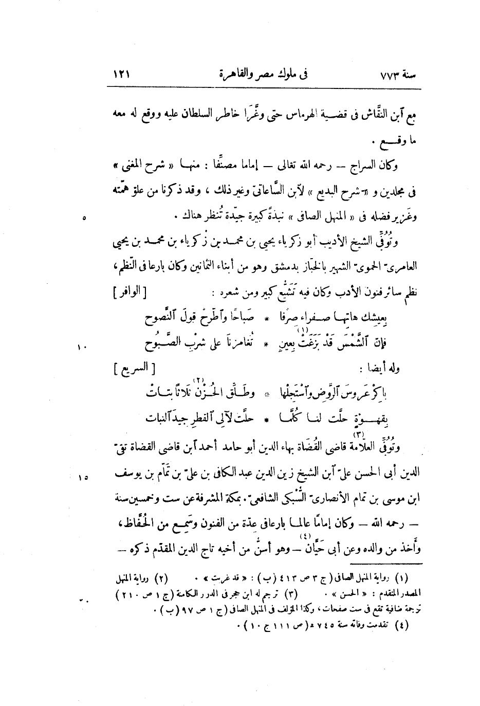 وكان السراج- رحمه الله تعالى- إماما مصنّفا: منها «شرح المغنى» فى مجلدين و «شرح البديع» لابن السّاعاتىّ وغير ذلك، وقد ذكرنا من علوّ همّته وغزير فضله فى «المنهل الصافى» نبذة كبيرة جيّدة تنظر هناك.