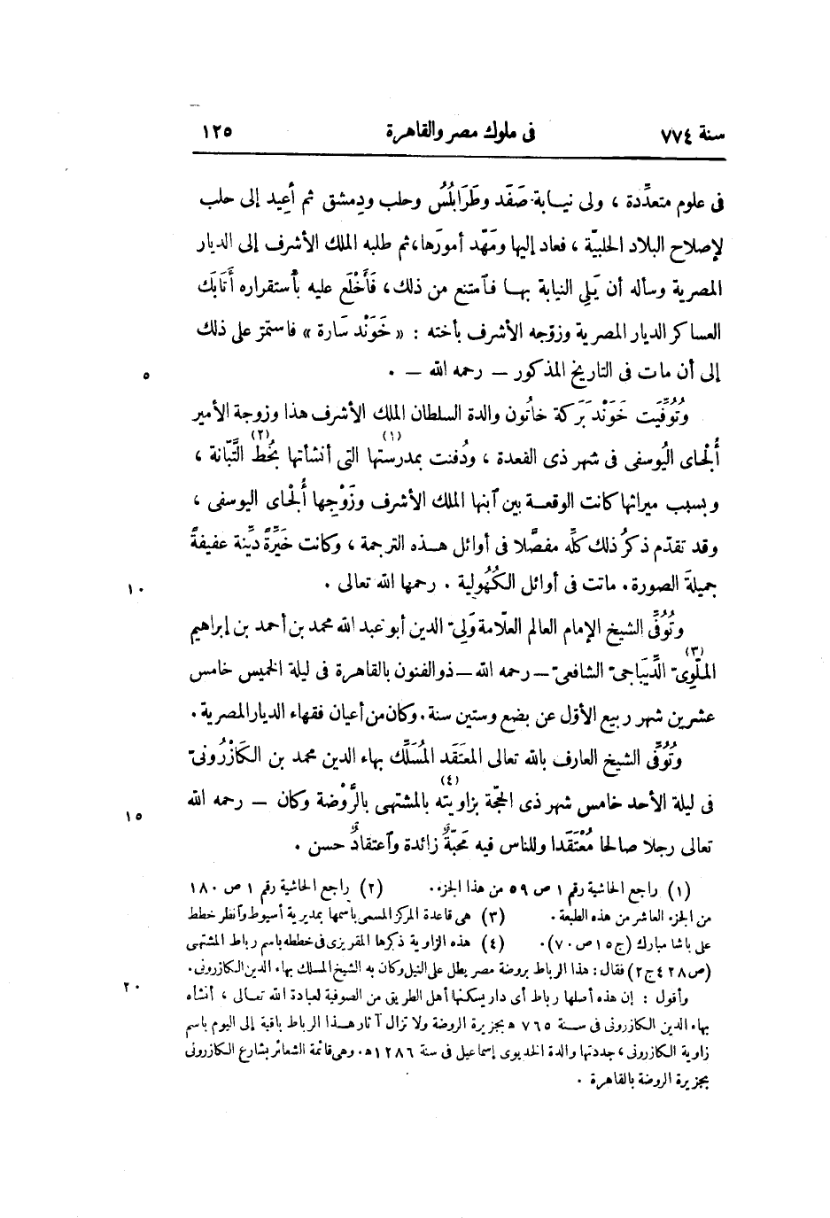 وتوفّى الشيخ العارف بالله تعالى المعتقد المسلّك بهاء الدين محمد بن الكازرونىّ فى ليلة الأحد خامس شهر ذى الحجّة بزاويته «4» بالمشتهى بالرّوضة وكان- رحمه الله تعالى رجلا صالحا معتقدا وللناس فيه محبّة زائدة واعتقاد حسن.