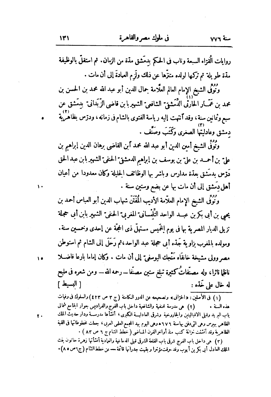 وتوفّى الشيخ الإمام العلّامة الأديب المفتن شهاب الدين أبو العباس أحمد بن يحيى بن أبى بكر بن عبد الواحد التّلمسانىّ المغربىّ الحنفىّ الشهير بابن أبى حجلة نزيل الديار المصرية بها في يوم الخميس مستهلّ ذى الحجّة عن إحدى وخمسين سنة.