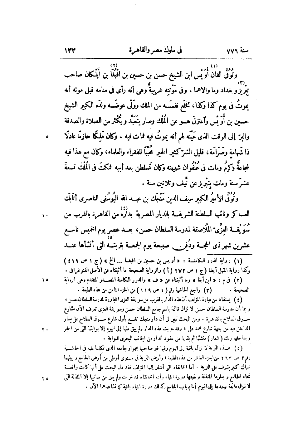 وتوفّى القان «1» أويس ابن الشيخ حسن بن حسين بن اقبغا «2» بن أيلكان صاحب تبريز «3» وبغداد وما والاهما. وفي موتته غريبة وهي أنه رأى في منامه قبل موته أنه يموت في يوم كذا وكذا، فخلع نفسه من الملك وولّى عوضه ولده الكبير الشيخ حسين بن أويس واعتزل هو عن الملك وصار يتعبّد ويكثر من الصلاة والصدقة والبرّ إلى الوقت الذي عيّنه لهم أنه يموت فيه فمات فيه. وكان ملكا حازما عادلا ذا شهامة وصرامة، قليل الشرّ كثير الخير محبّبا للفقراء والعلماء، وكان مع هذا فيه شجاعة وكرم ومات في عنفوان شبيبته وكان تسلطن بعد أبيه فمكث في الملك تسعة عشر سنة ومات بتبريز عن نيّف وثلاثين سنة.