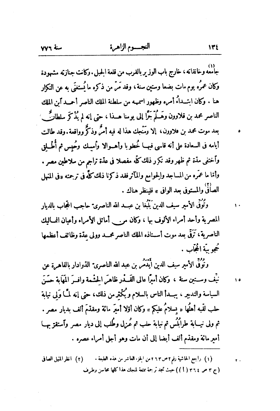 جامعه «1» وخانقاته، خارج باب الوزير بالقرب من قلعة الجبل. وكانت جنازته مشهودة وكان عمره يوم مات بضعا وستين سنة، وقد مرّ من ذكره ما يستغنى به عن التكرار هنا. وكان ابتداء أمره وظهور اسمه من سلطنة الملك الناصر أحمد ابن الملك الناصر محمد بن قلاوون وهلمّ جرّا إلى يومنا هذا، حتى إنه لم يذكر سلطان بعد موت محمد بن قلاوون، إلا ومنجك هذا له فيه أمر وذكر وواقعة. وقد طالت أيامه في السعادة على أنه قاسى فيها خطوبا وأهوالا وأمسك وحبس ثم أطلق واختفى مدّة ثم ظهر وقد تكرر ذلك كلّه مفصلا في عدّة تراجم من سلاطين مصر.