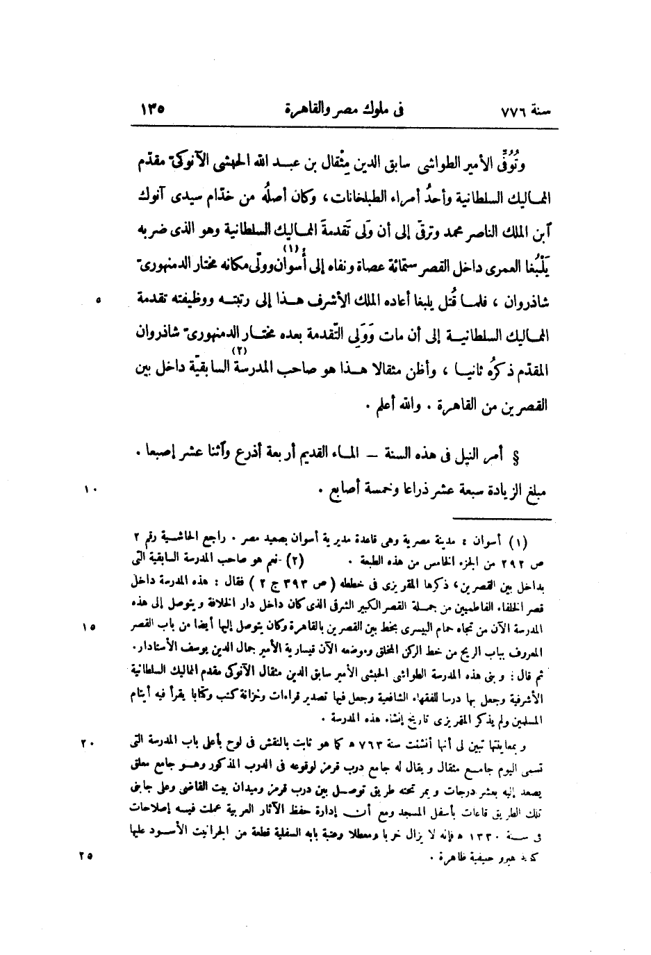 وتوفّى الأمير الطواشى سابق الدين مثقال بن عبد الله الحبشى الآنوكىّ مقدّم المماليك السلطانية وأحد أمراء الطبلخانات، وكان أصله من خدّام سيدى آنوك ابن الملك الناصر محمد وترقّى إلى أن ولى تقدمة المماليك السلطانية وهو الذي ضربه يلبغا العمرى داخل القصر ستمائة عصاة ونفاه إلى أسوان «1» وولّى مكانه مختار الدمنهورىّ شاذروان، فلما قتل يلبغا أعاده الملك الأشرف هذا إلى رتبته ووظيفته تقدمة المماليك السلطانية إلى أن مات وولى التّقدمة بعده مختار الدمنهورىّ شاذروان المقدّم ذكره ثانيا، وأظن مثقالا هذا هو صاحب المدرسة «2» السابقيّة داخل بين القصرين من القاهرة. والله أعلم.