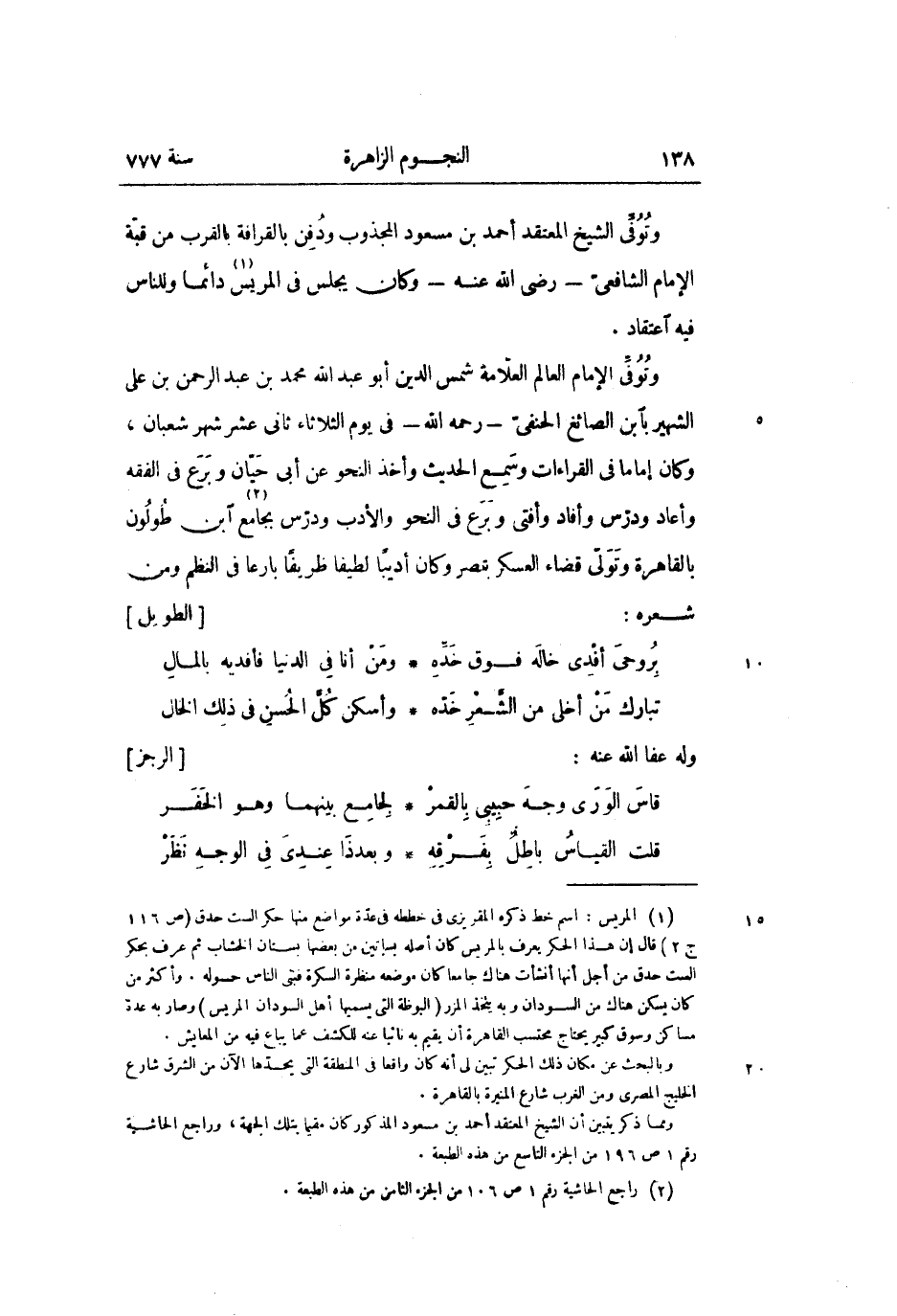 وتوفّى الشيخ المعتقد أحمد بن مسعود المجذوب ودفن بالقرافة بالقرب من قبّة الإمام الشافعىّ- رضى الله عنه- وكان يجلس في المريس «1» دائما وللناس فيه اعتقاد.