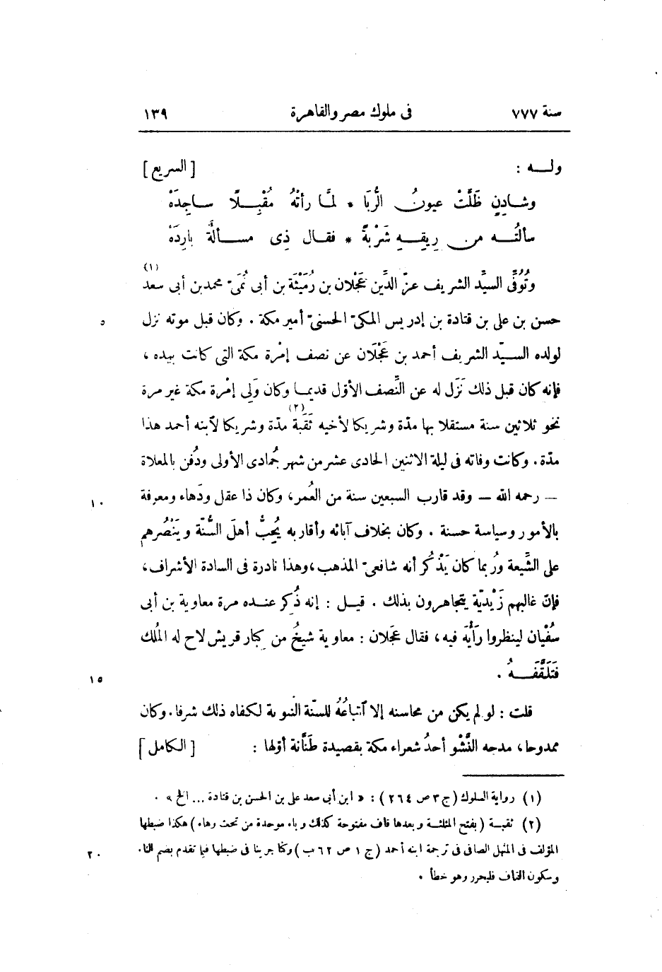 وتوفّى السيّد الشريف عزّ الدّين عجلان بن رميثة بن أبى نمىّ محمد بن أبى سعد «1» حسن بن على بن قتادة بن إدريس المكىّ الحسنىّ أمير مكة. وكان قبل موته نزل لولده السيّد الشريف أحمد بن عجلان عن نصف إمرة مكة التي كانت بيده، فإنه كان قبل ذلك نزل له عن النّصف الأوّل قديما وكان ولى إمرة مكة غير مرة نحو ثلاثين سنة مستقلا بها مدّة وشريكا لأخيه ثقبة «2» مدّة وشريكا لابنه أحمد هذا مدّة. وكانت وفاته في ليلة الاثنين الحادى عشر من شهر جمادى الأولى ودفن بالمعلاة- رحمه الله- وقد قارب السبعين سنة من العمر، وكان ذا عقل ودهاء ومعرفة بالأمور وسياسة حسنة. وكان بخلاف آبائه وأقاربه يحبّ أهل السّنّة وينصرهم على الشّيعة وربما كان يذكر أنه شافعىّ المذهب، وهذا نادرة في السادة الأشراف، فإنّ غالبهم زيديّة يتجاهرون بذلك. قيل: إنه ذكر عنده مرة معاوية بن أبى سفيان لينظروا رأيه فيه، فقال عجلان: معاوية شيخ من كبار قريش لاح له الملك فتلقّفه.