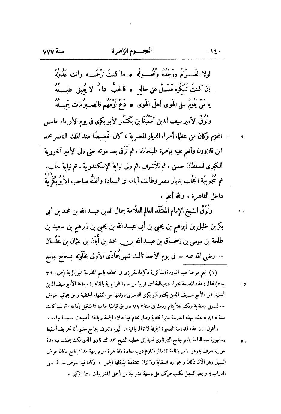 وتوفّى الشيخ الإمام المعتقد العالم العلّامة جمال الدين عبد الله بن محمد بن أبى بكر بن خليل بن إبراهيم بن يحيى بن أبى عبد الله بن يحيى بن إبراهيم بن سعيد بن طلحة بن موسى بن إسحاق بن عبد الله بن محمد بن أبان بن عثمان بن عفّان- رضى الله عنه- فى يوم الأحد ثالث شهر جمادى الأولى بخلوته بسطح جامع