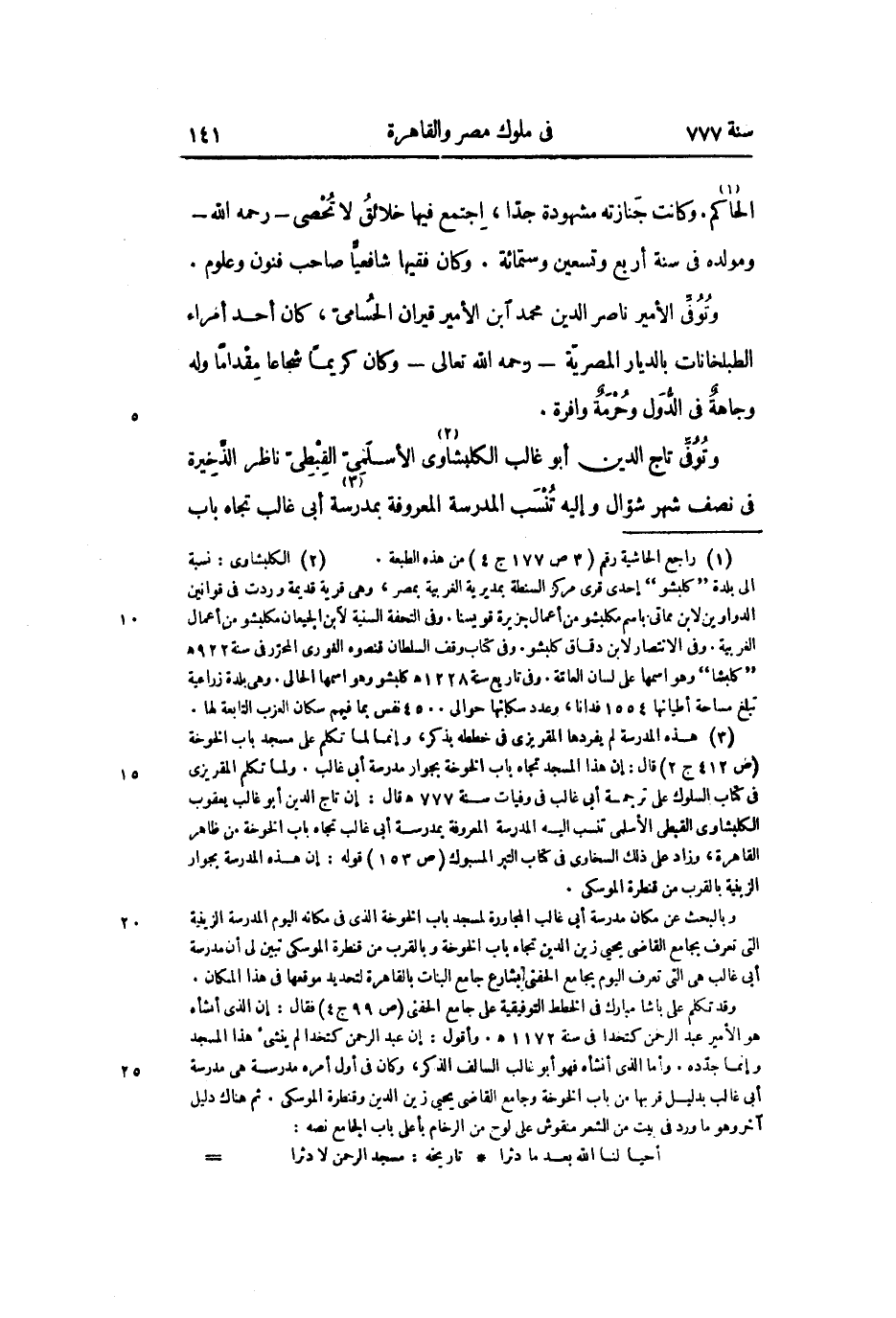 وتوفّى تاج الدين أبو غالب الكلبشاوى «2» الأسلمىّ القبطىّ ناظر الذّخيرة فى نصف شهر شوّال وإليه تنسب المدرسة المعروفة بمدرسة «3» أبى غالب تجاه باب